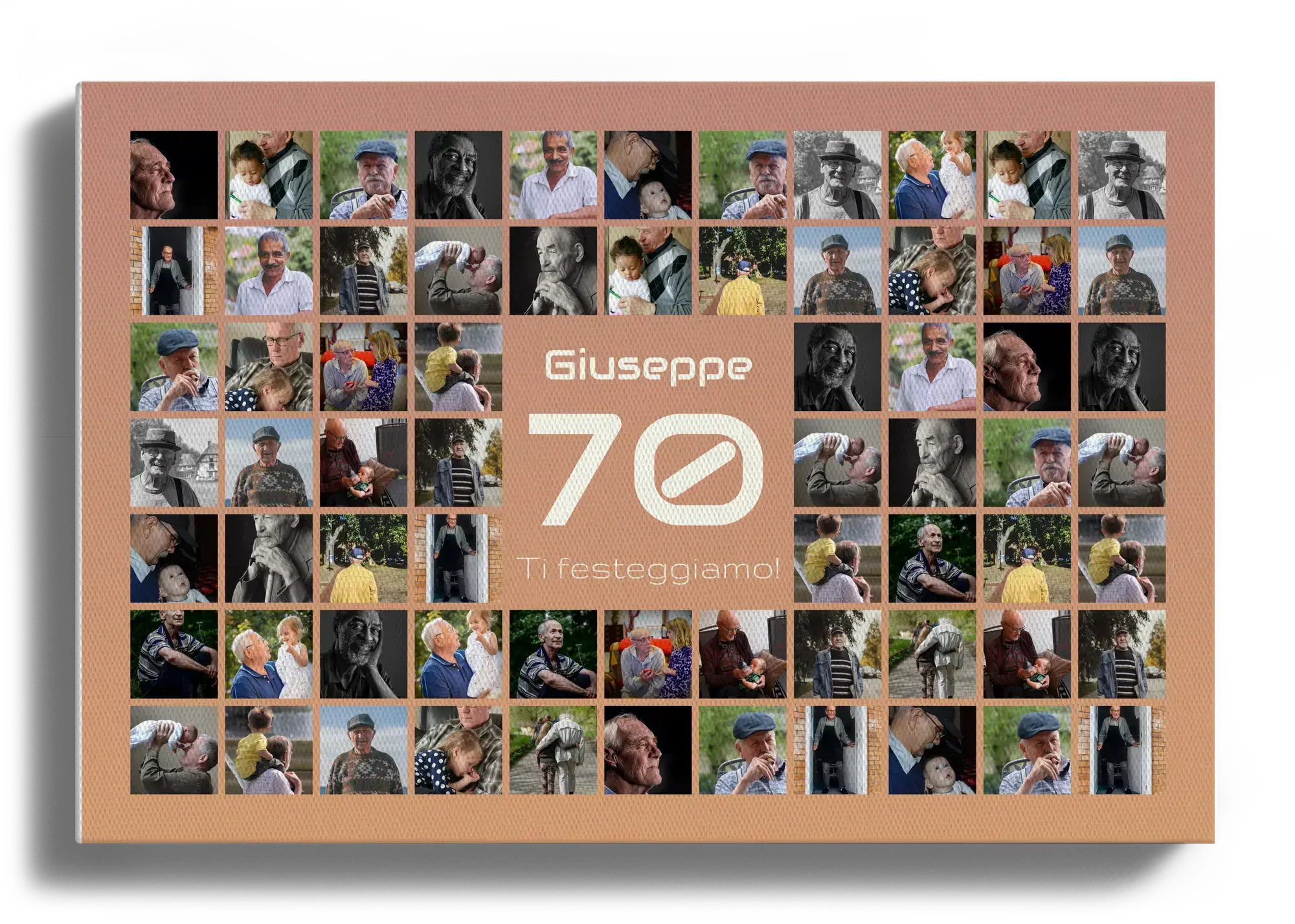 Collage 70 personalizzato: nome, dedica, 20–80 foto; idea regalo per 70° compleanno o anniversario.