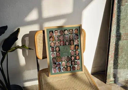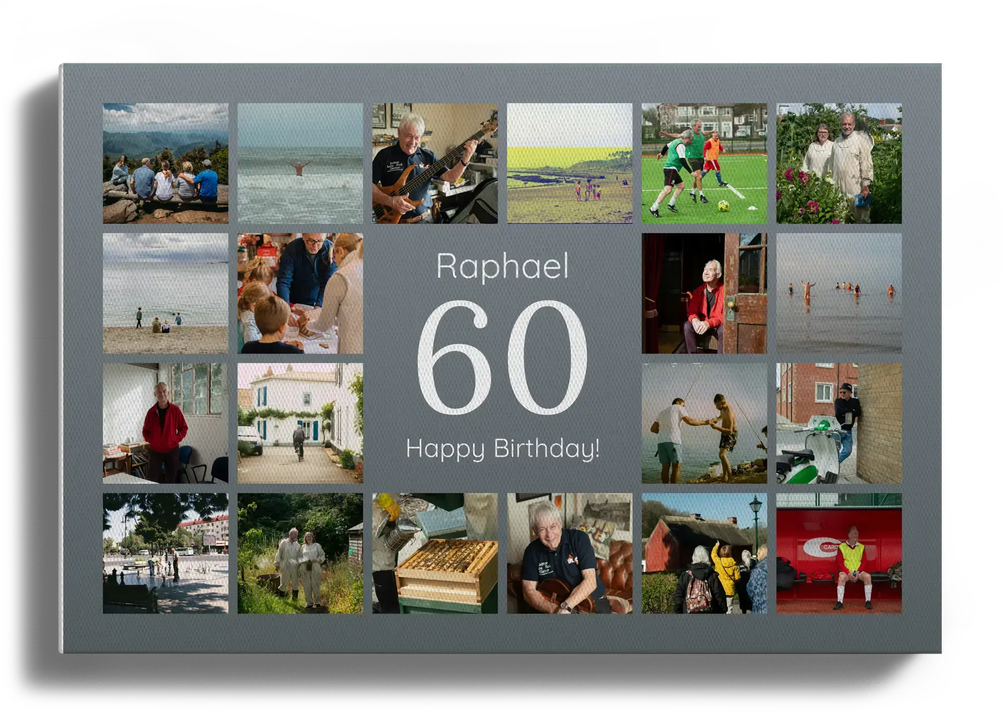 Crea ora la tua Collage Numero 60: un grande 60 al centro, il nome sopra e un messaggio sotto, circondati da 20–80 foto in un elegante raster. Personalizzi numero, nome, testo, quantità di immagini, sfondo, colori e orientamento. Perfetta per 60° compleanno, nozze di diamante o pensione.