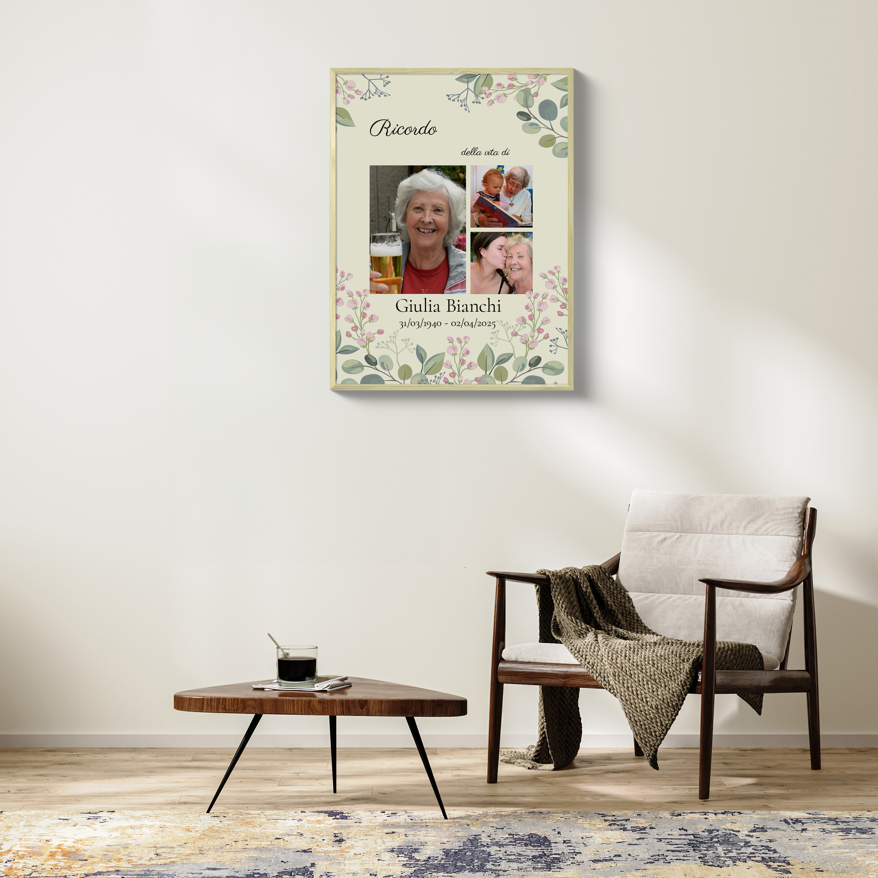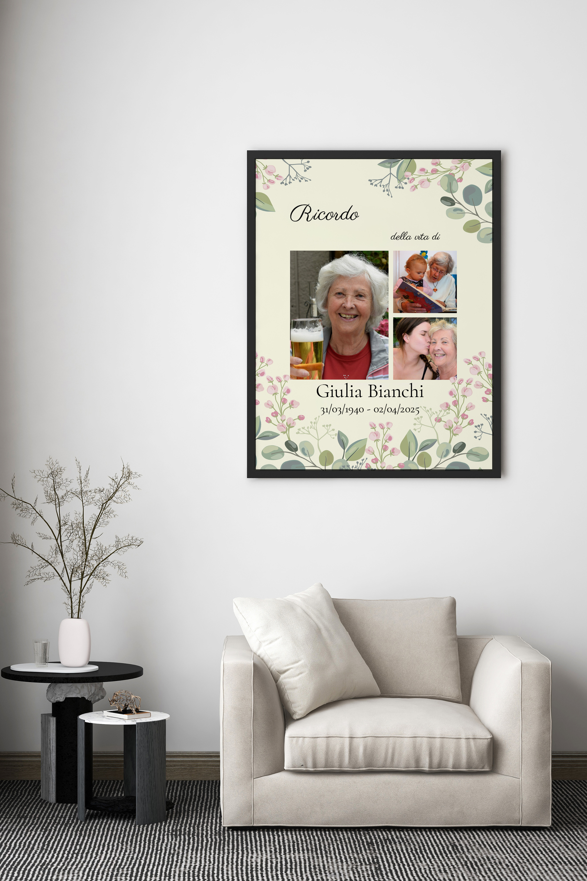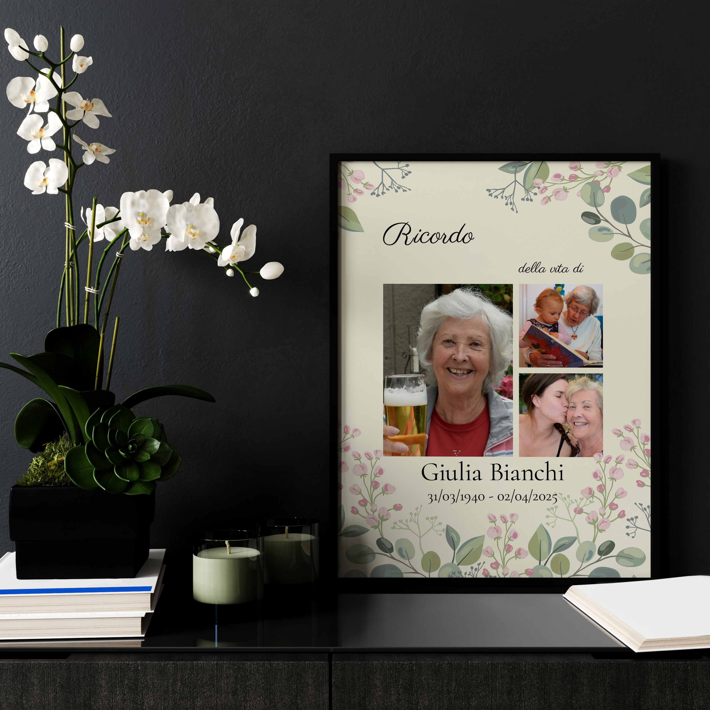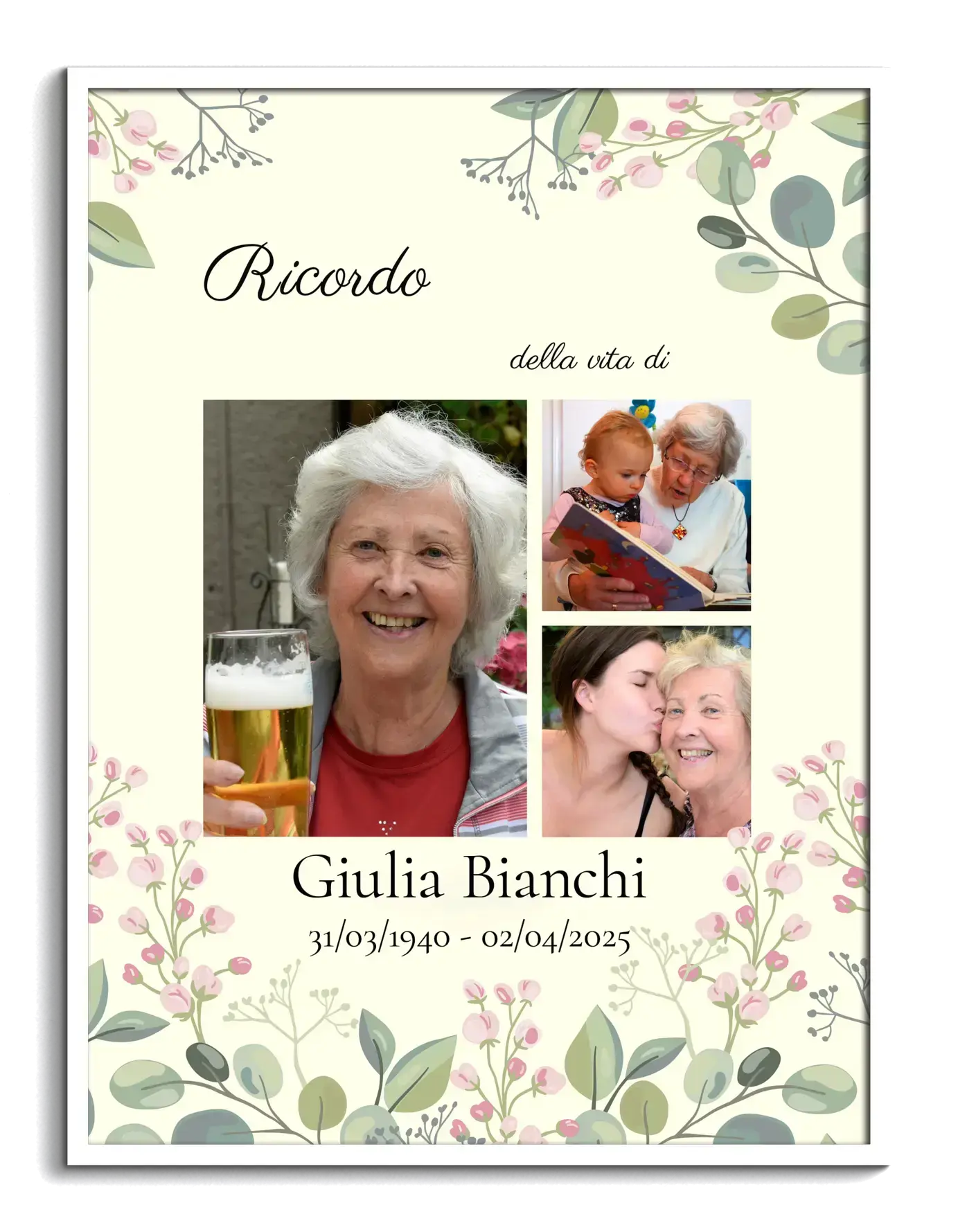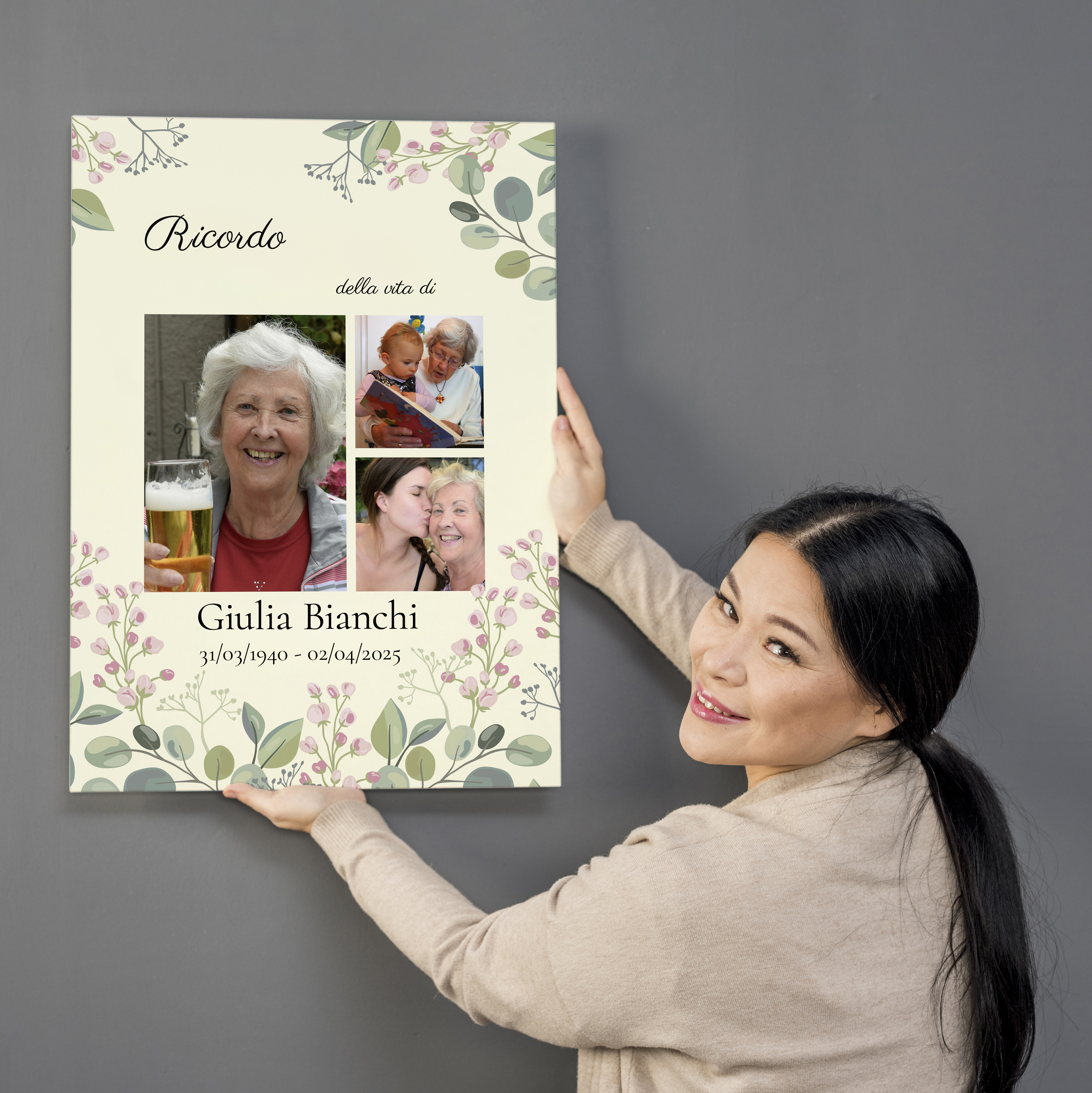 Elegante collage commemorativa personalizzabile su tela con fiori e sfondo verde chiaro.