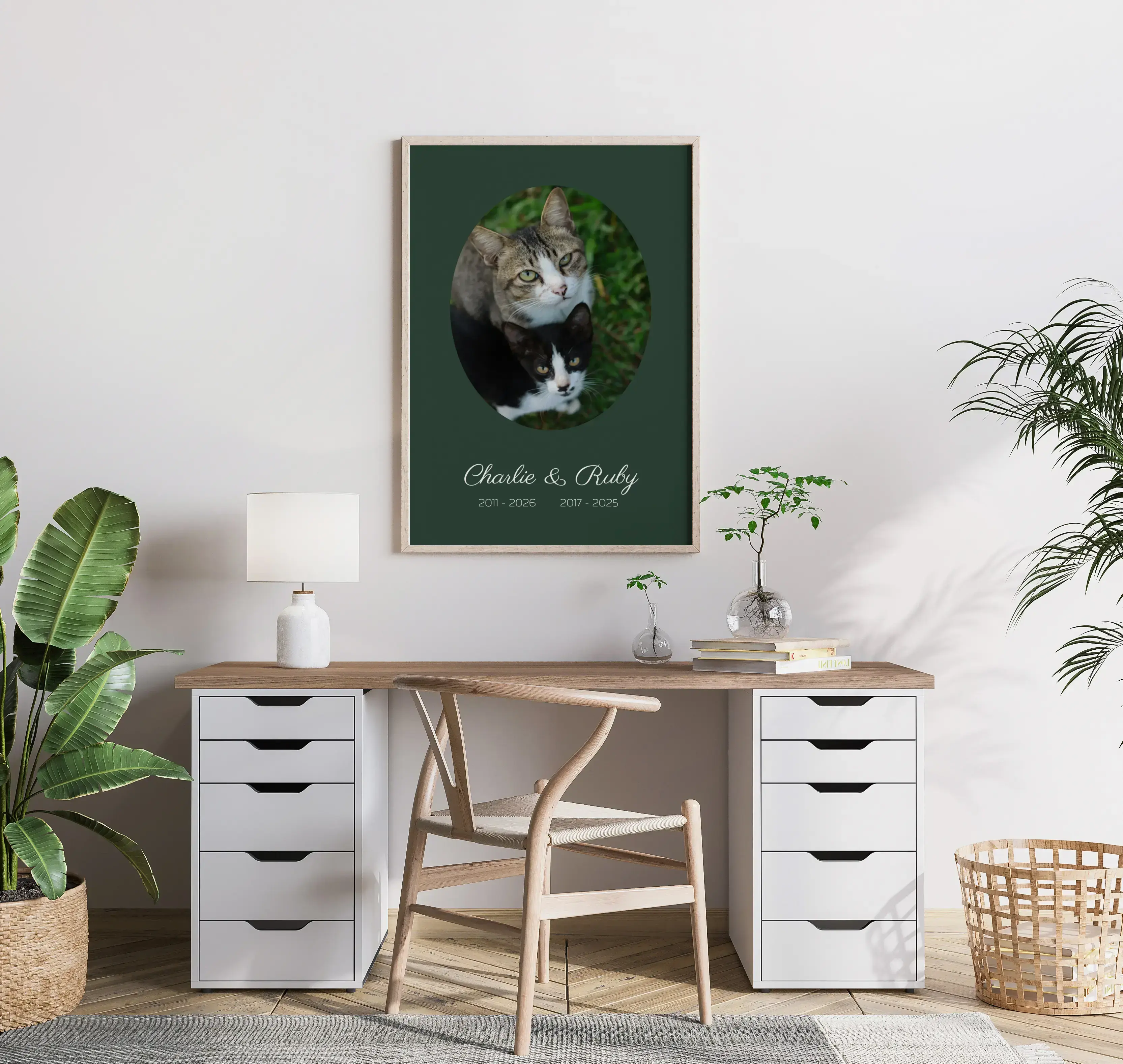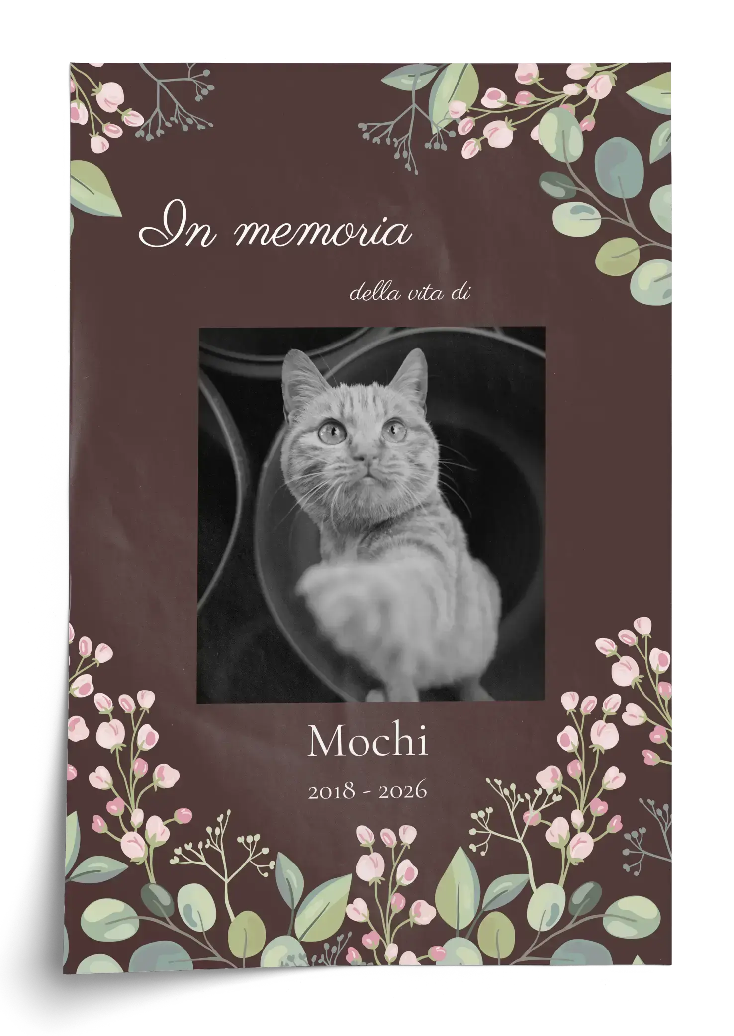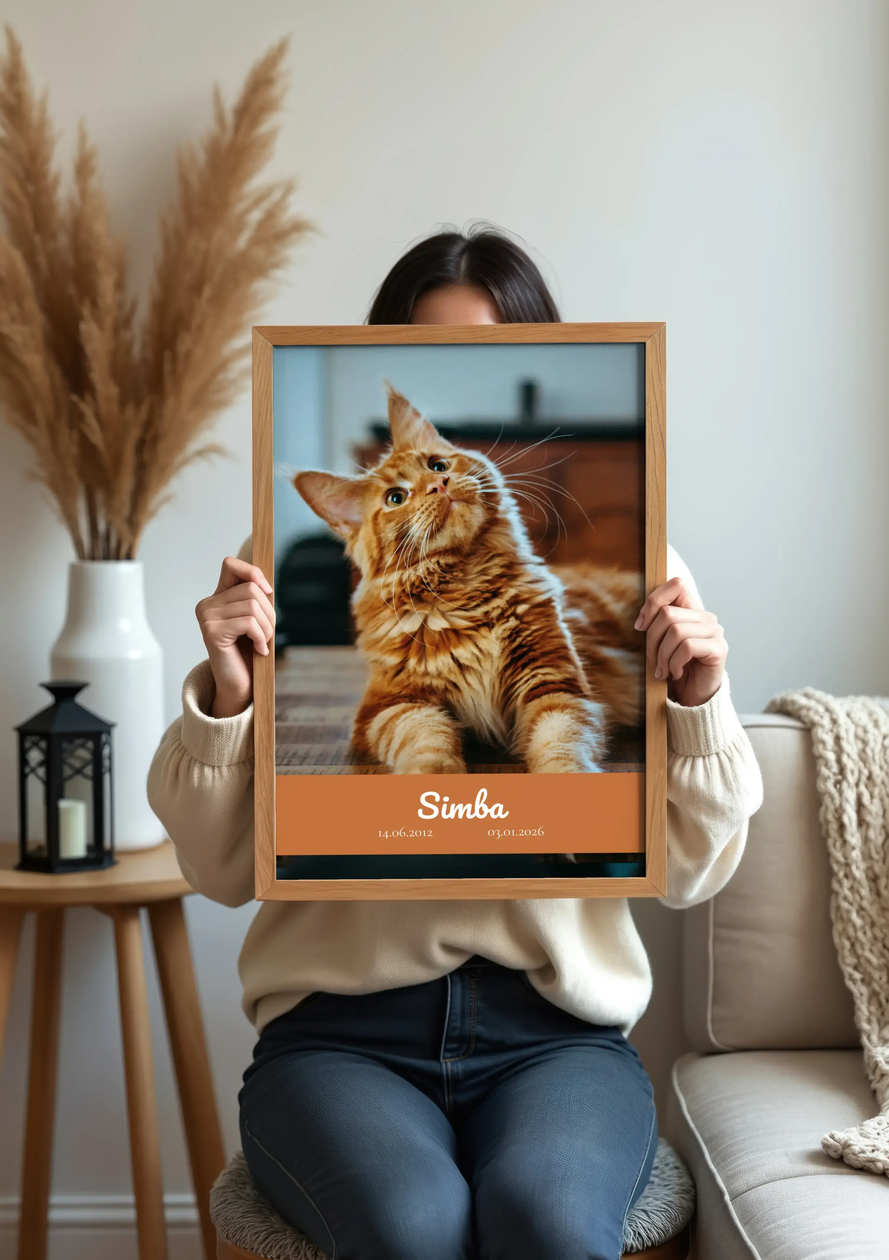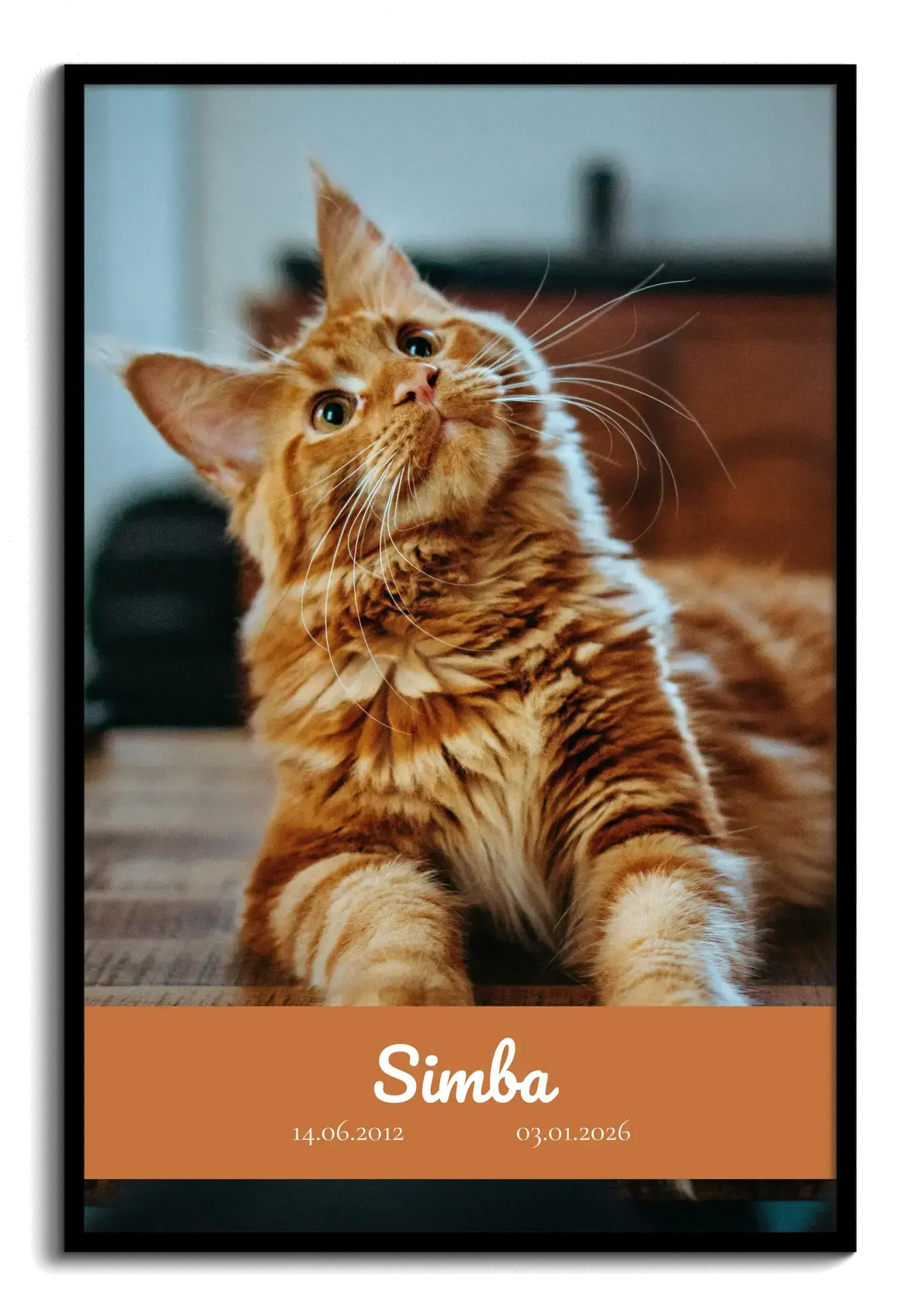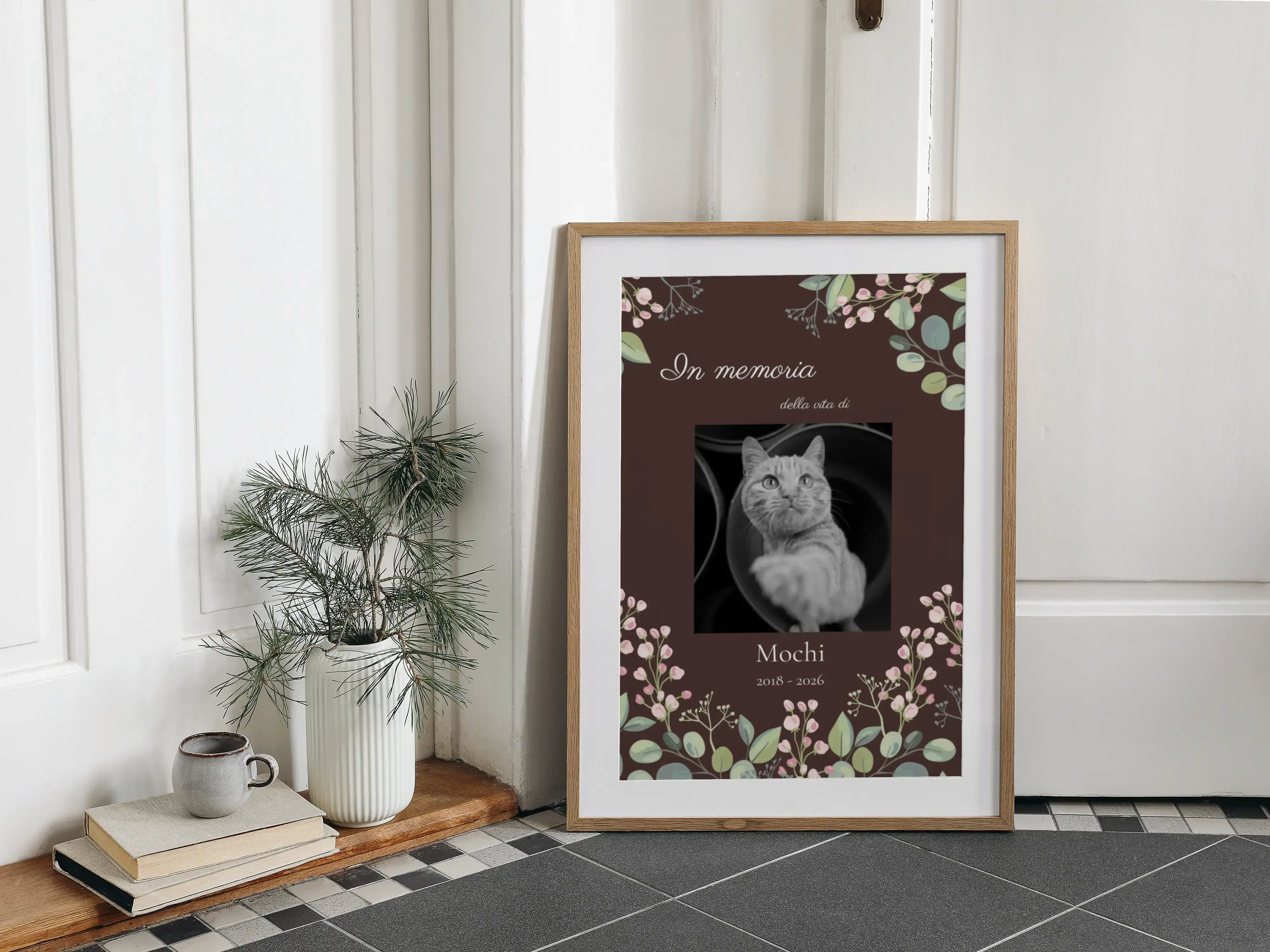 Collage commemorativo per gatto: foto unica, barra di testo con nome e date, personalizzabile.