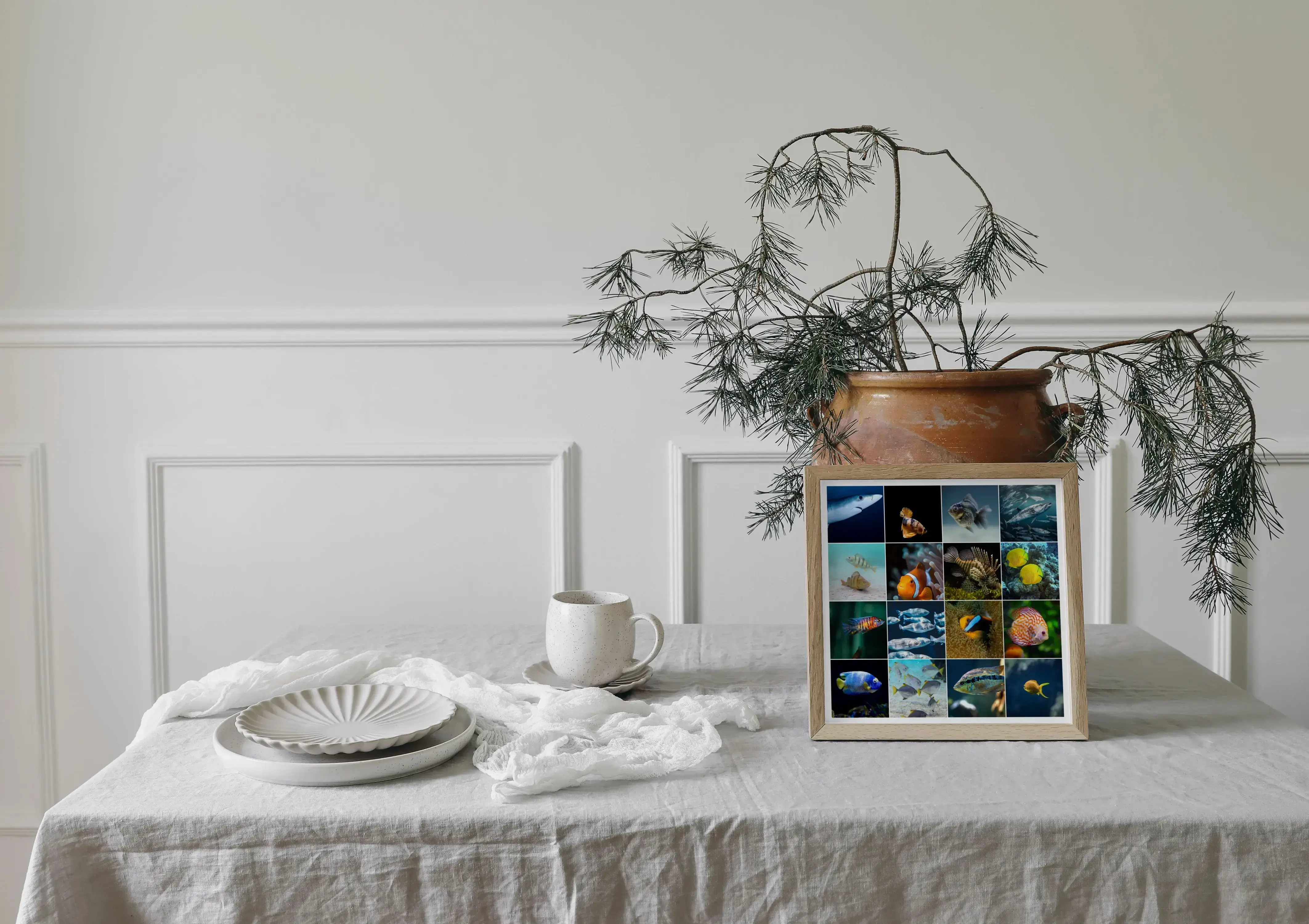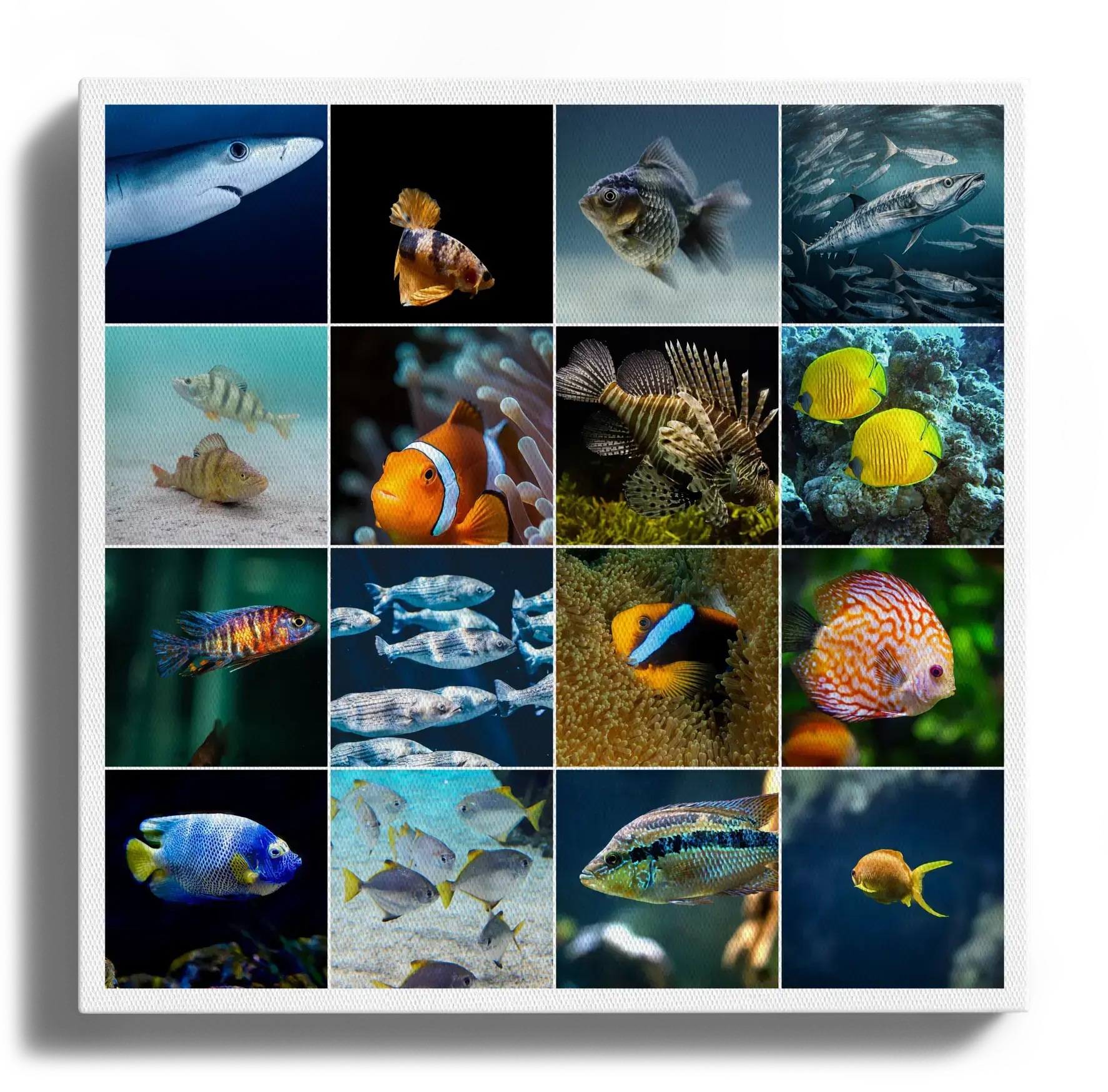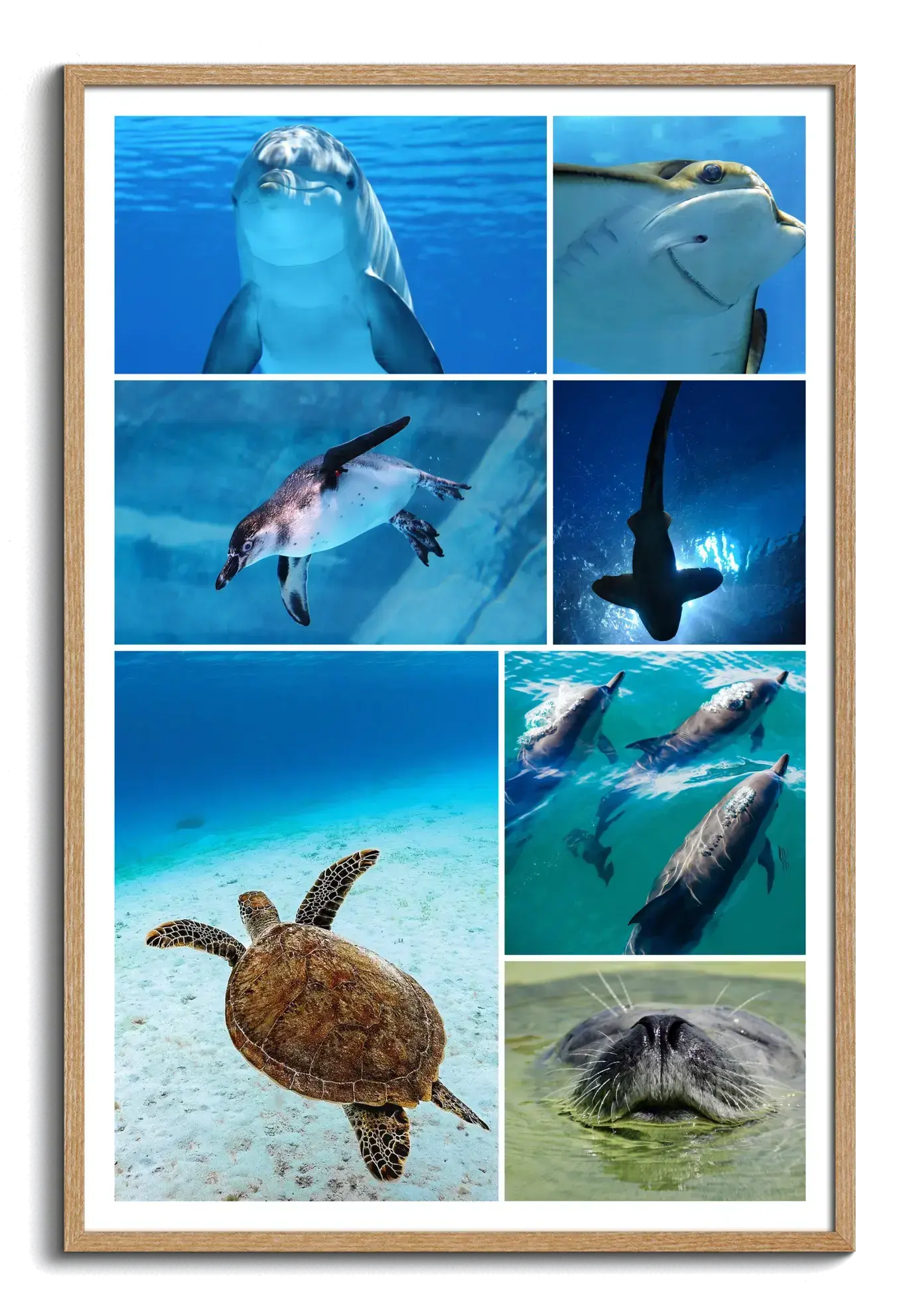 Crea ora la tua stampa personalizzata a tema Natura: Animali in libertà. In questo esempio puoi valorizzare la vita subacquea in un collage: pesci e coralli variopinti, squali in controluce, pinguini agili, tartarughe eleganti, meduse e delfini curiosi, momenti di immersione e snorkeling, dal blu profondo ai riflessi di superficie, con resa di stampa premium.