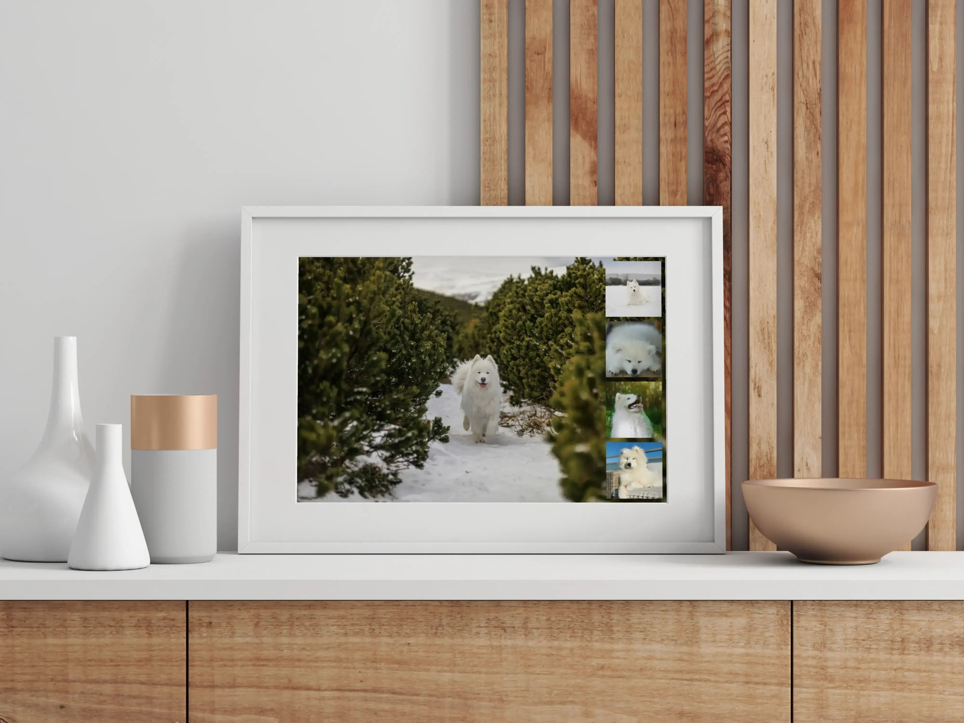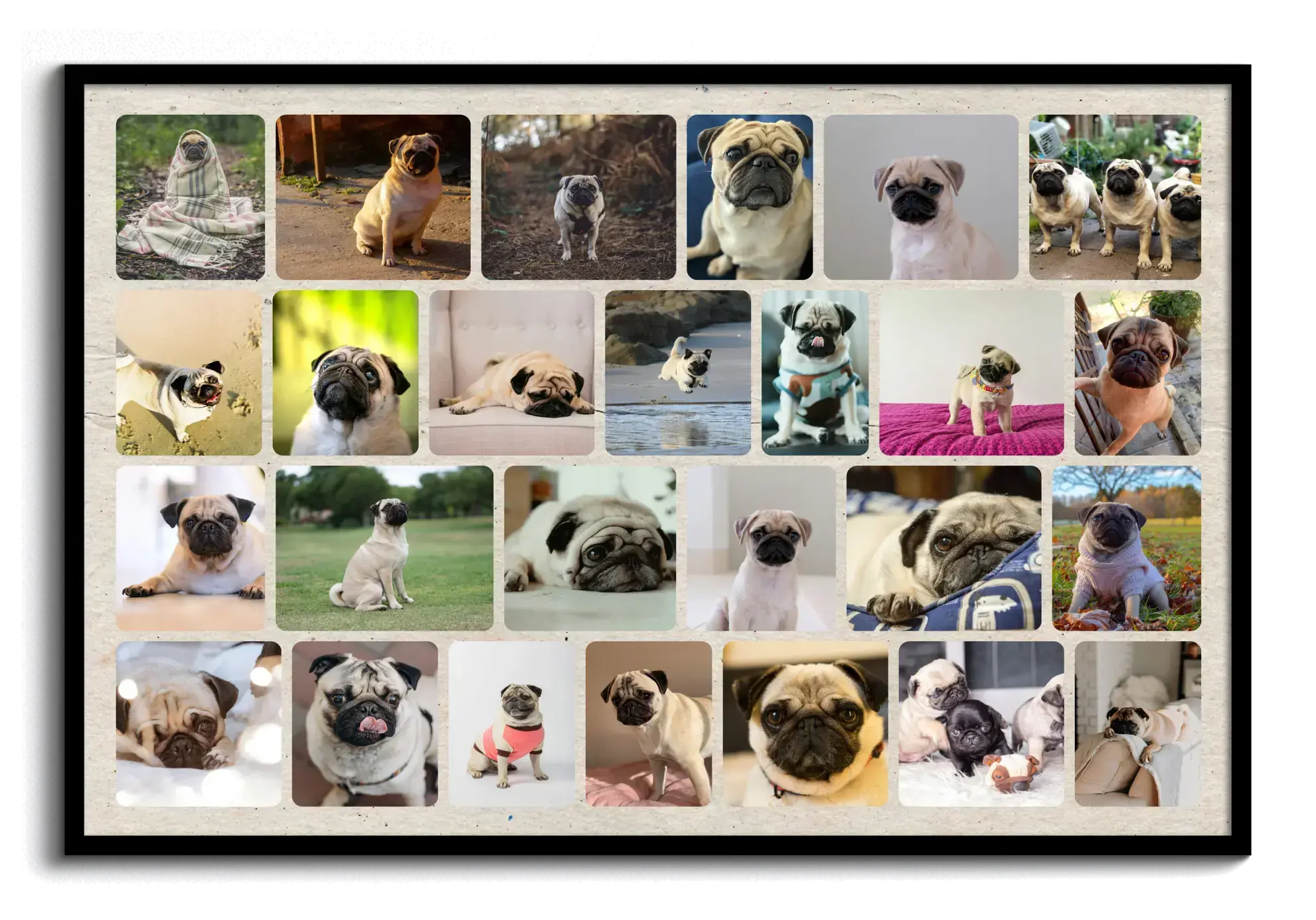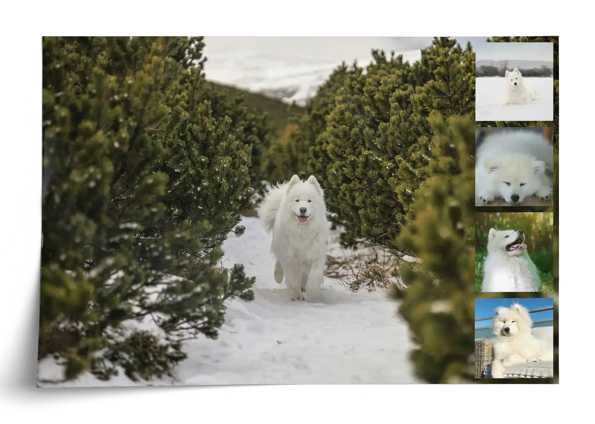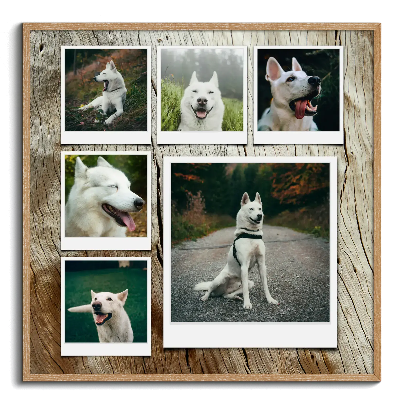 Fotocollage del cane con tanti stili: Polaroid, griglia o sfondo grande, personalizzabile.