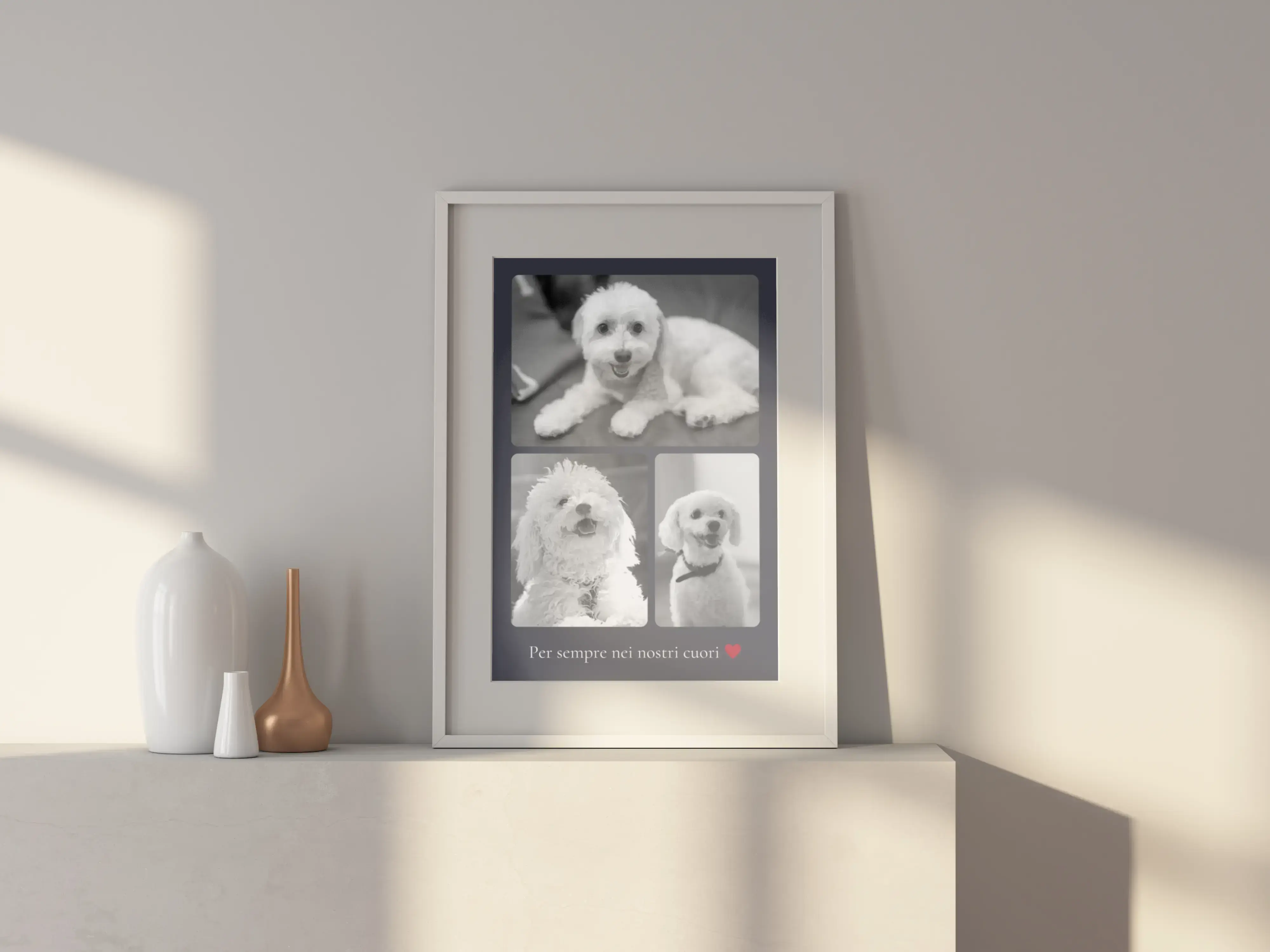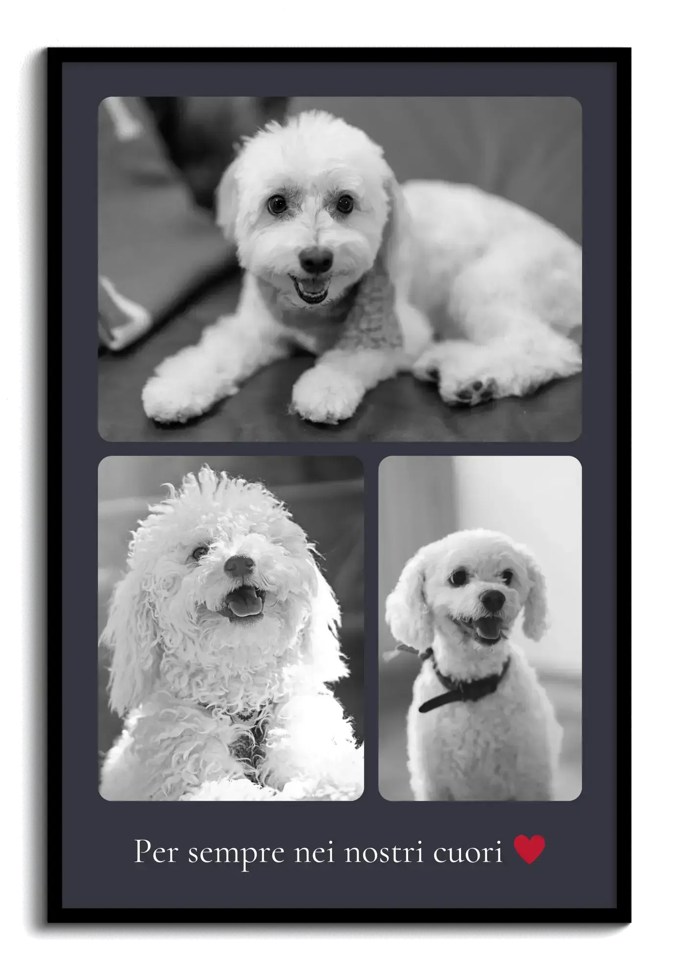 Crea ora il tuo ricordo per il tuo cane. Ecco un esempio pronto: una stampa d’arte dedicata al tuo compagno, con collage personalizzabile per il lutto. Scegli layout a cuore, griglia o testo; aggiungi frasi come Per sempre nei nostri cuori, nome e anni di nascita e scomparsa. Più foto grandi in bianco e nero, con una dedica ❤️.
