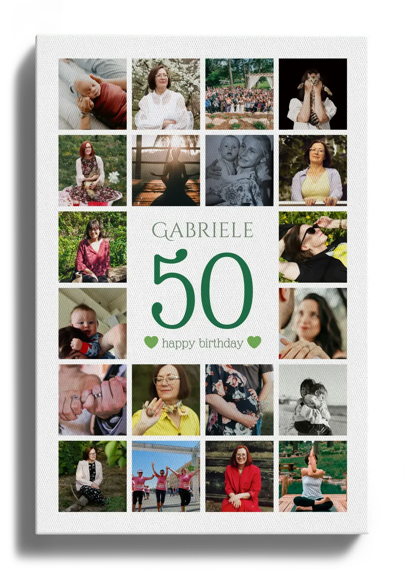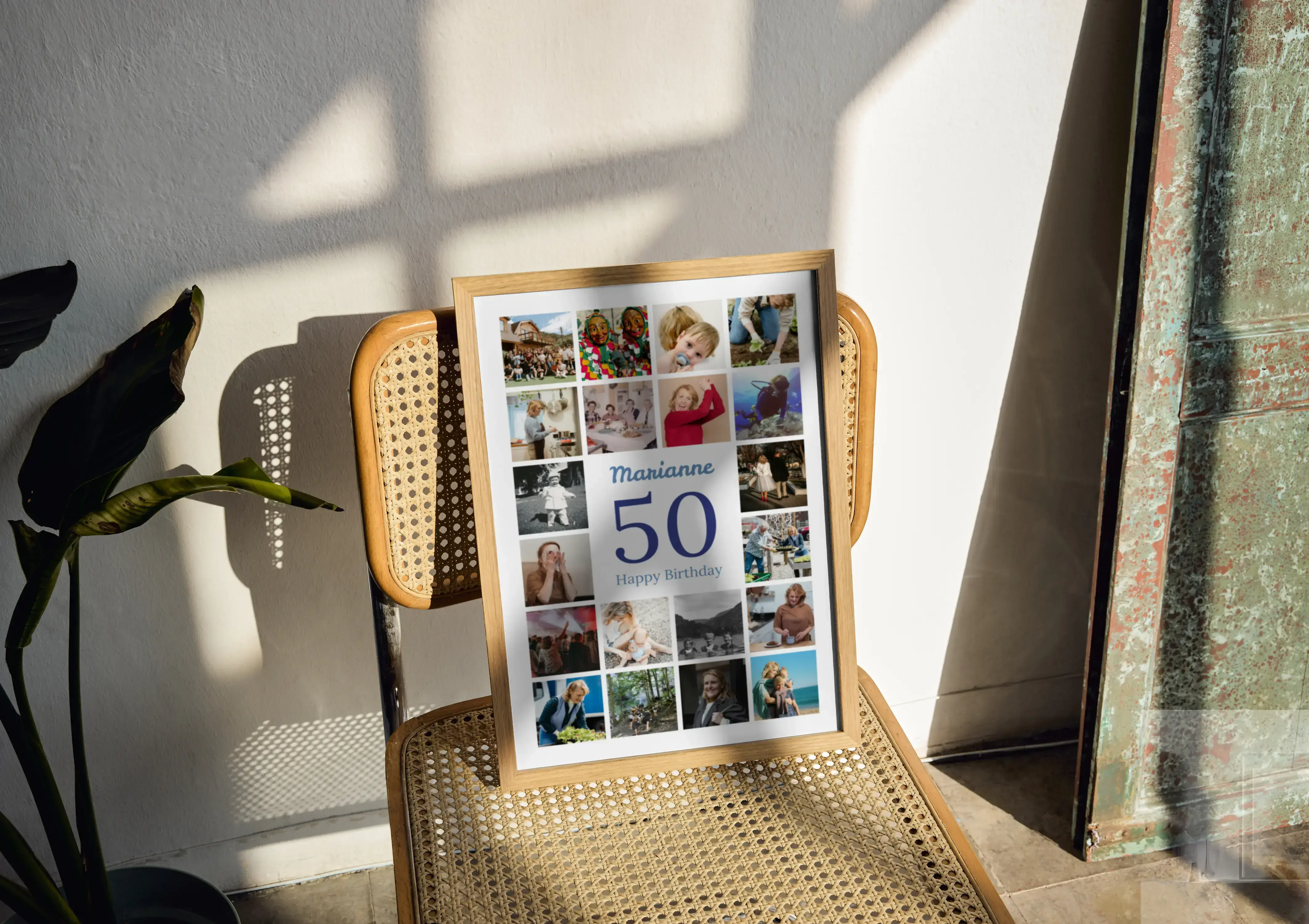 Collage foto 50° compleanno: crea il tuo regalo con 20–80 foto, nome e auguri