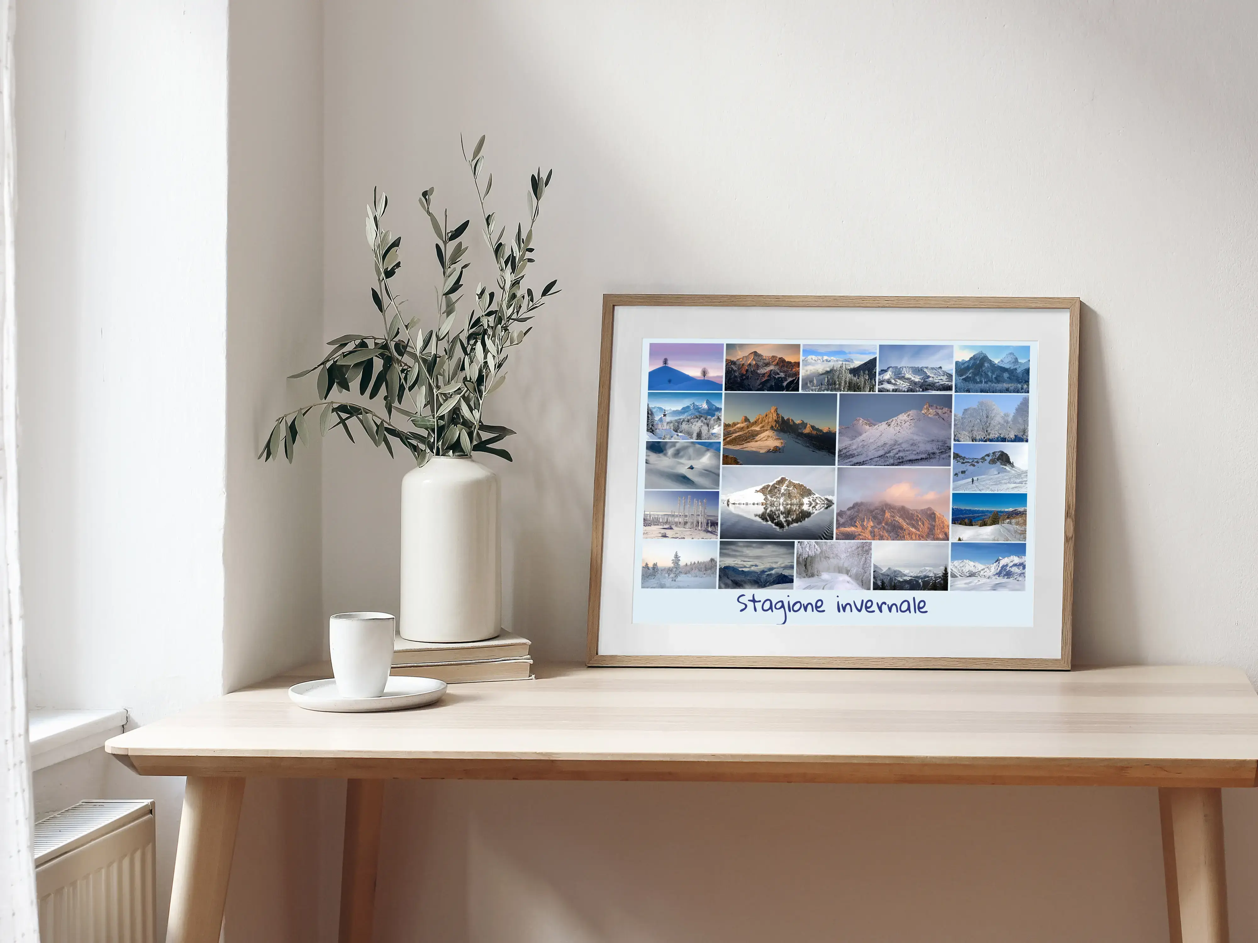 Crea ora la tua stampa personalizzata. In questo esempio a tema paesaggi metti in scena la natura in tutte le stagioni: boschi in estate, primavera, autunno e inverno, strade dorate d’autunno, prati fioriti d’estate, montagne dalle vette innevate e atmosfere d’inverno. Trasforma questi scatti in una composizione elegante, perfetta per la tua casa.