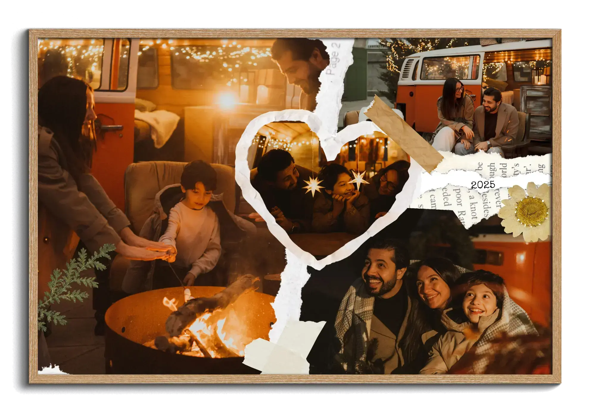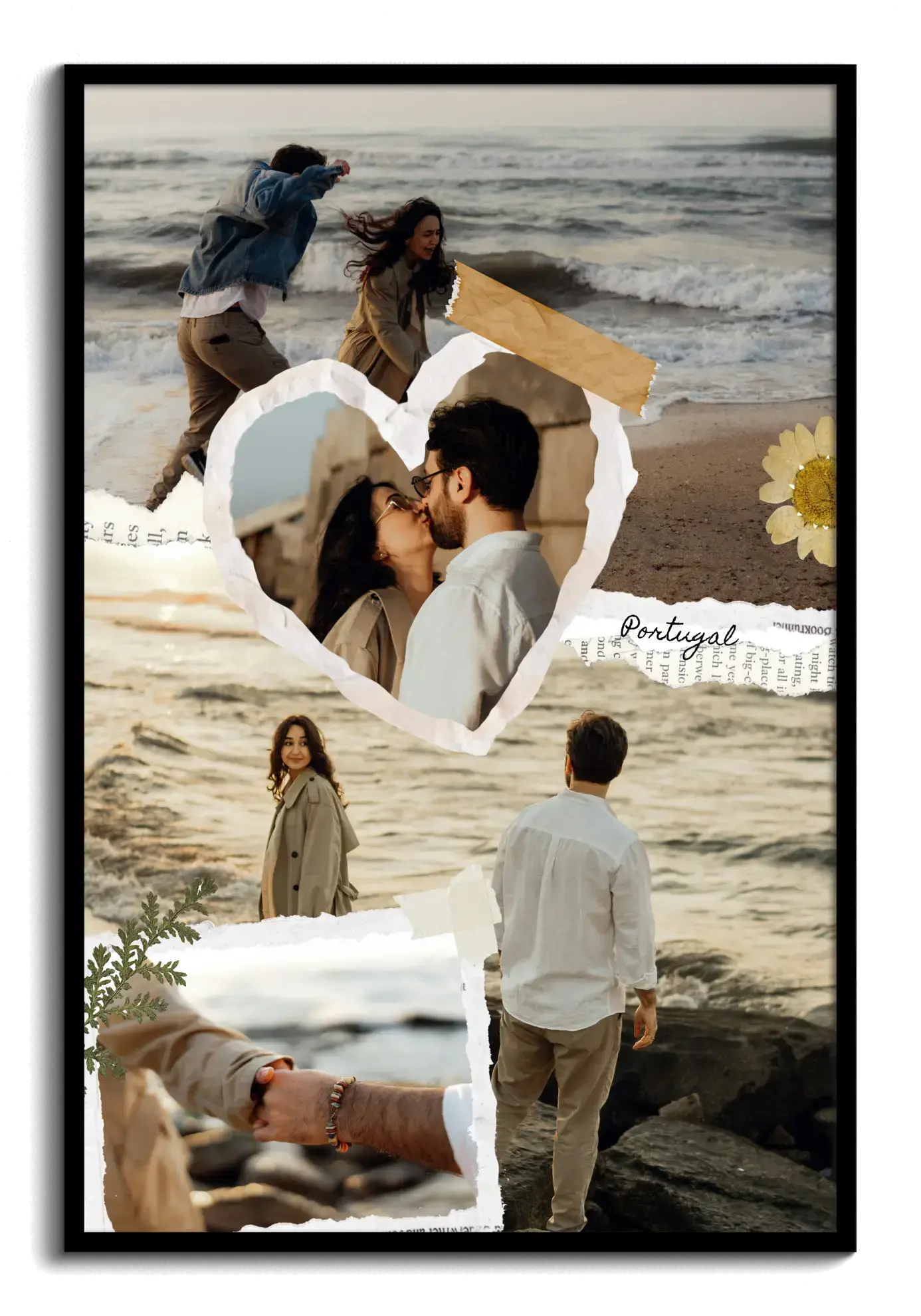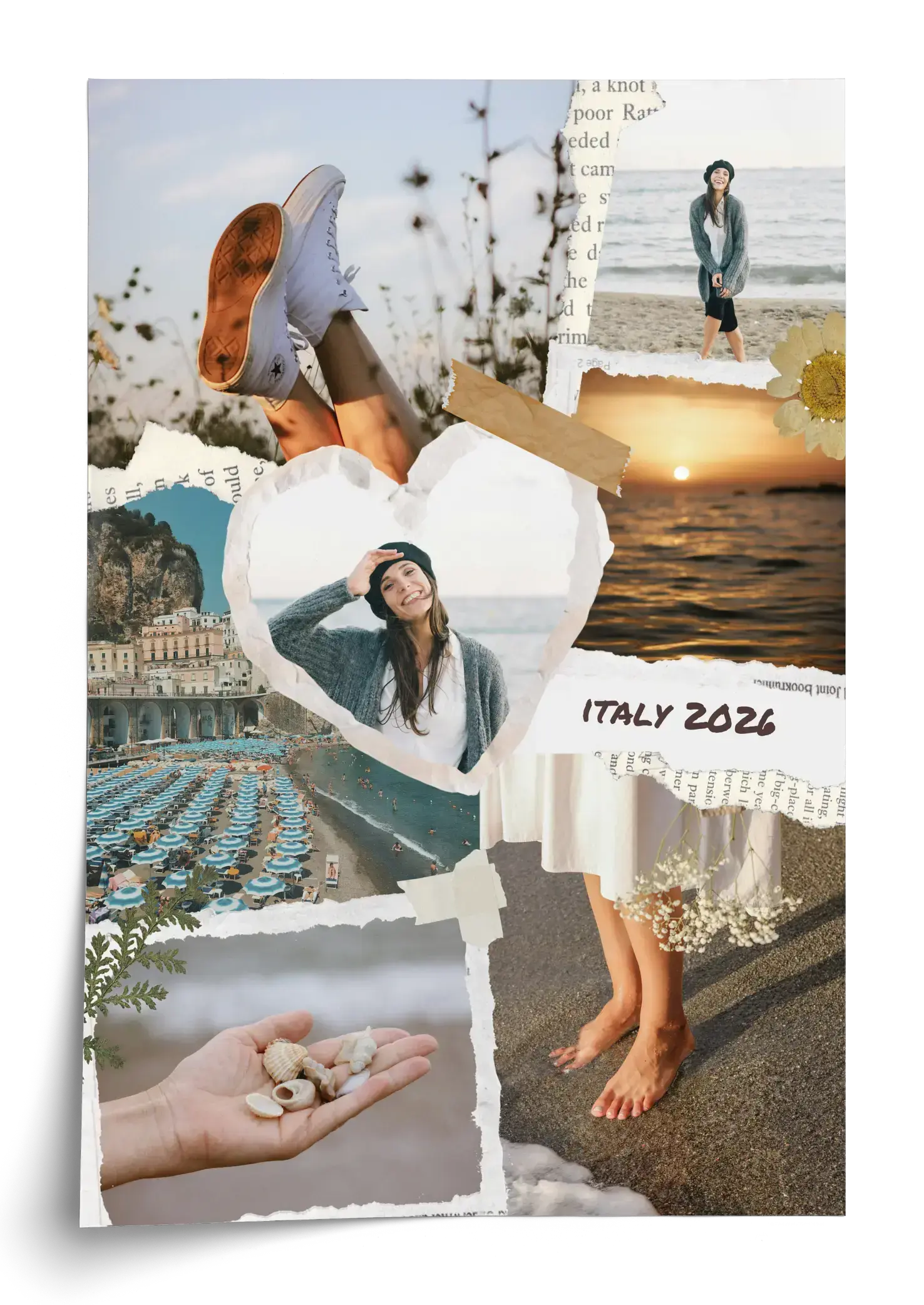 Crea ora il tuo poster artistico personalizzato in stile scrapbook dedicato alle vacanze. Le foto vengono combinate come ritagli di carta, con elementi tape, piccoli dettagli decorativi e scritte dall’effetto manuale come luogo, anno o una breve frase per raccontare ricordi di viaggio in modo caldo e creativo.