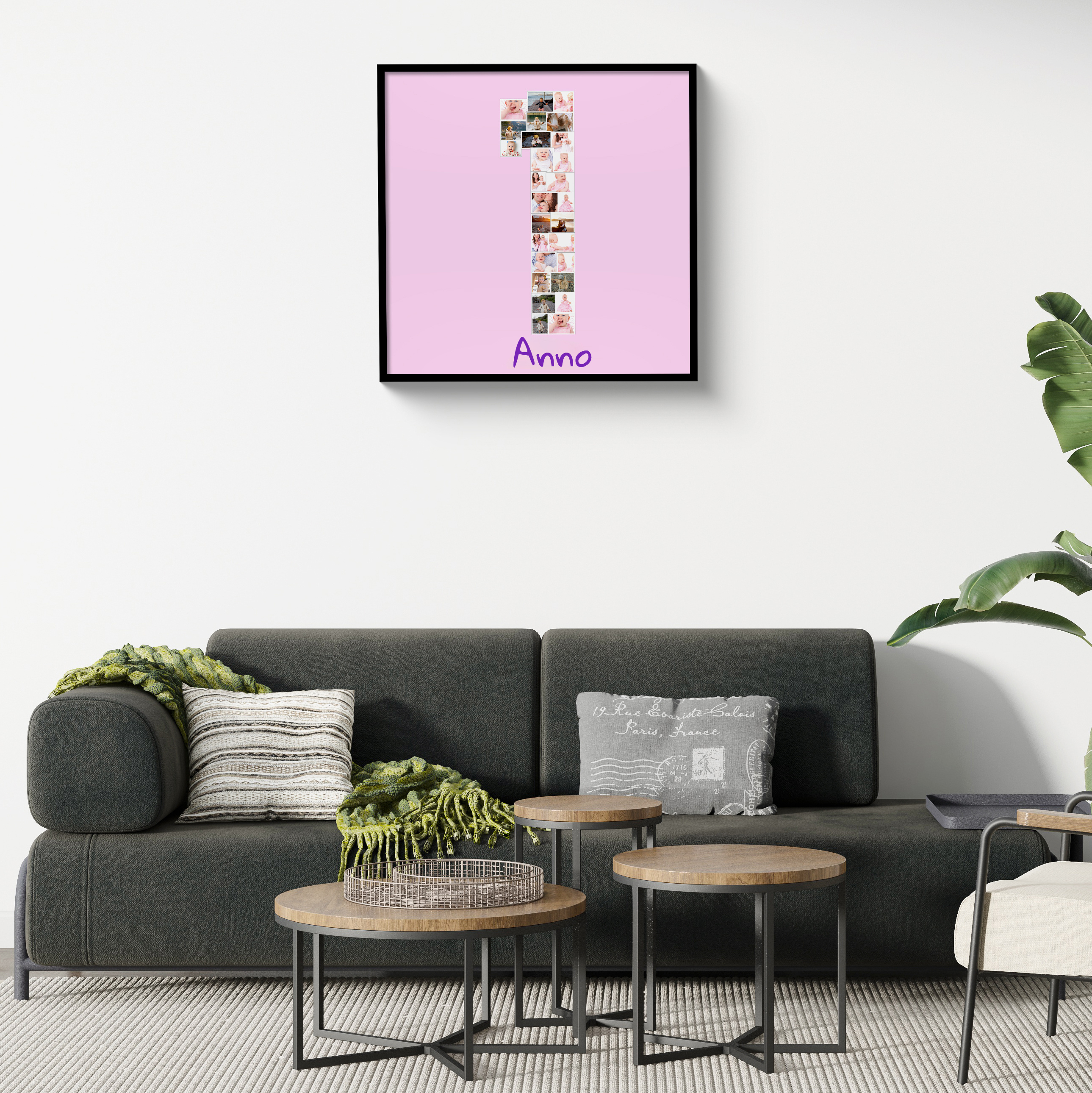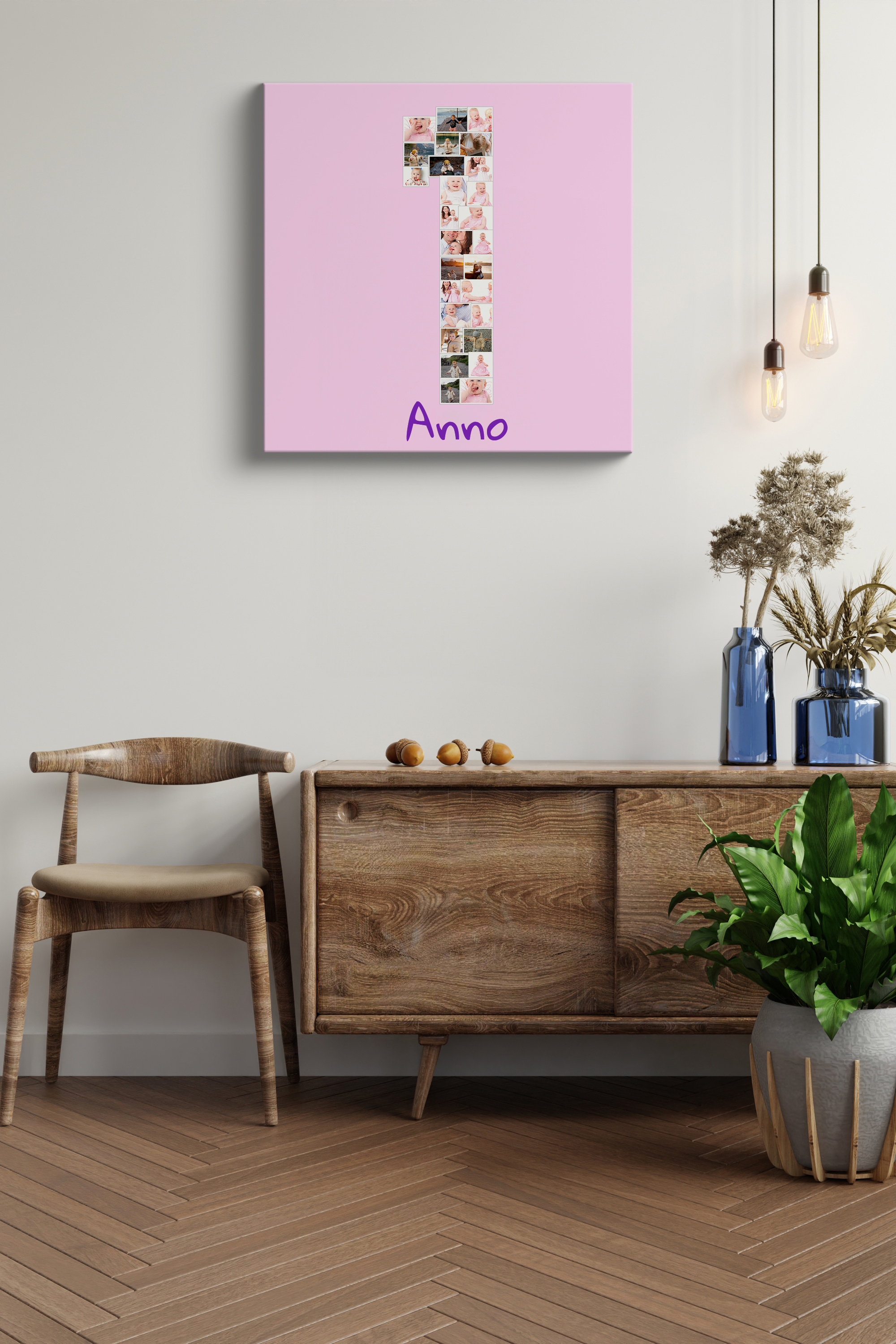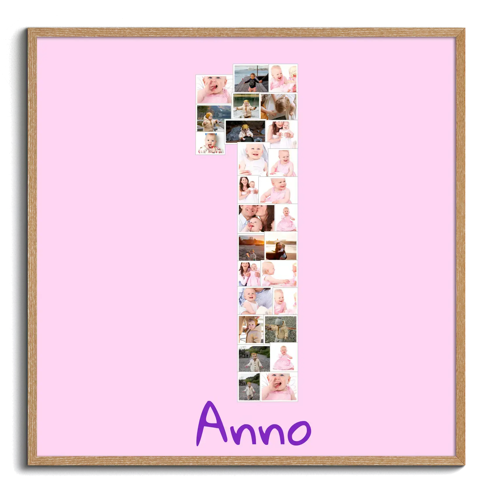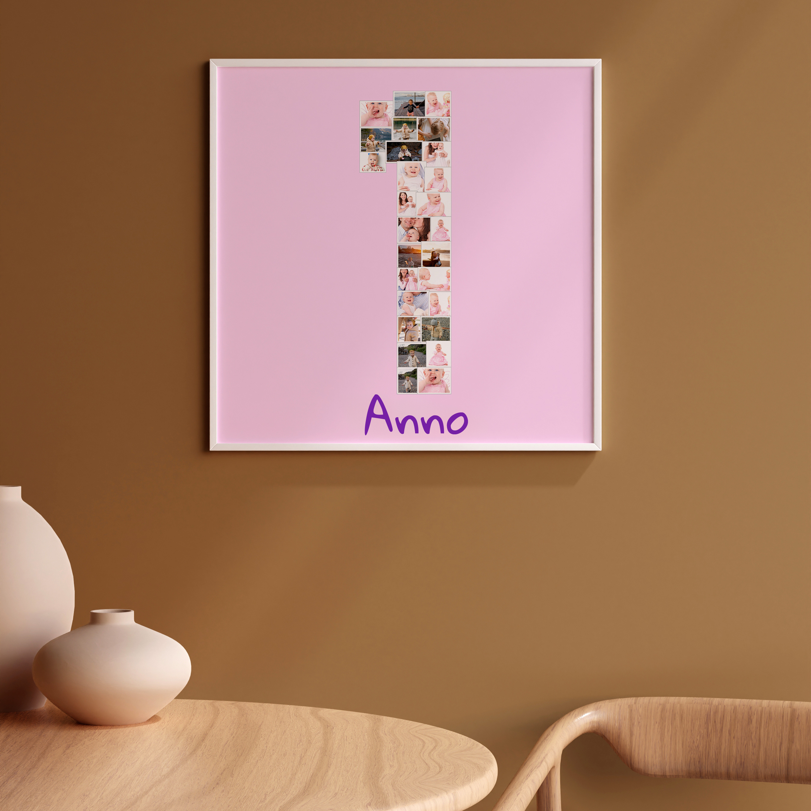 Crea una splendida fotocollage personalizzata per celebrare momenti indimenticabili. Immagina questo esempio: una vibrante Collage per il primo compleanno, dove la cifra "1" risalta su un dolce sfondo rosa, formata da foto significative del primo anno di vita di un bambino, completata dalla parola "Anno". Un regalo perfetto per genitori, nonni o come dono speciale per la nascita o il primo compleanno. Personalizza ogni dettaglio con le tue immagini e un testo che parli al cuore.