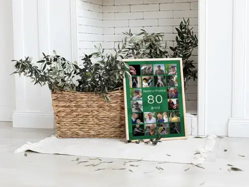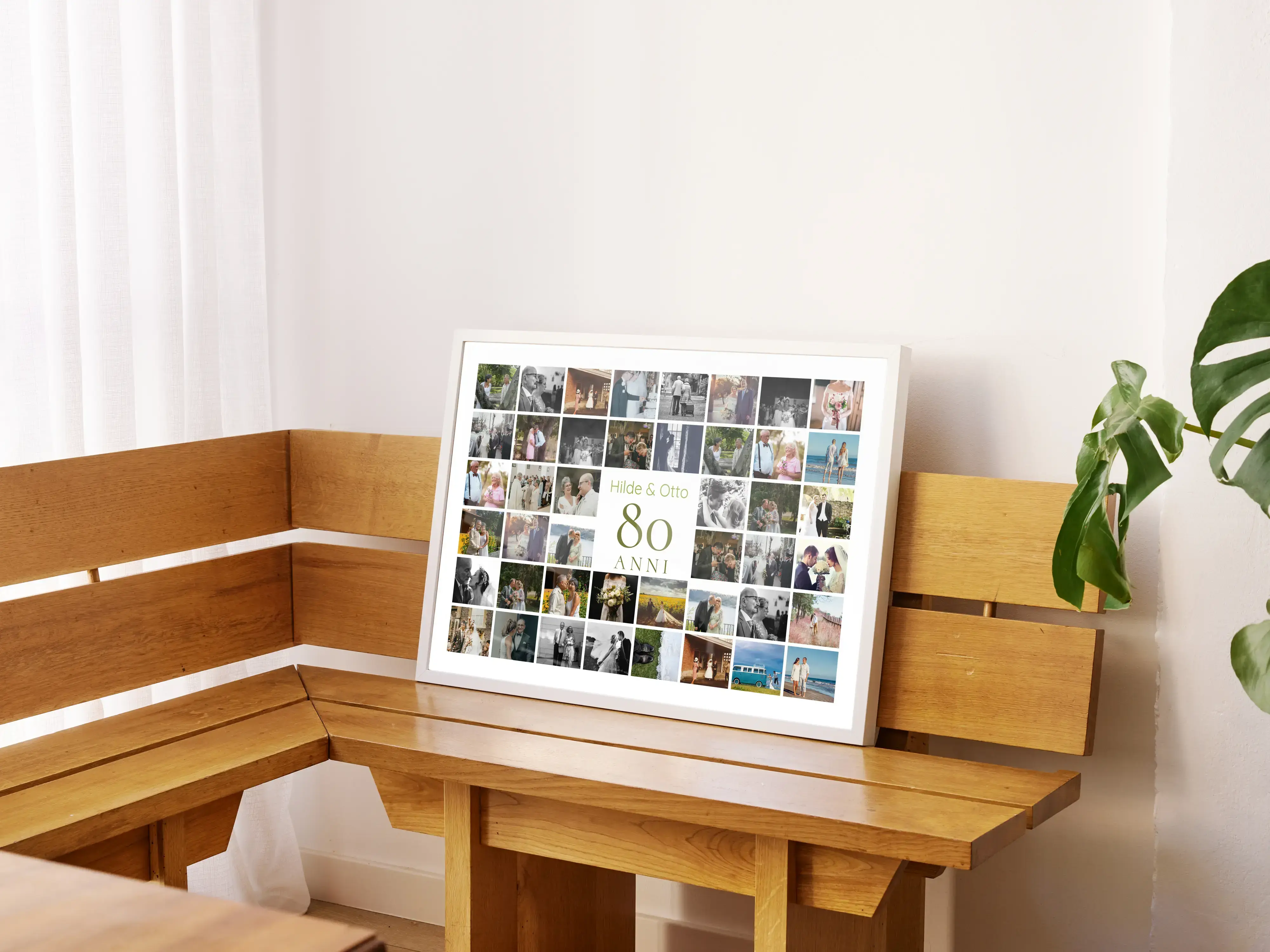 Collage 80 personalizzabile con nome, dedica e 20–80 foto: per 80° compleanno o anniversario.