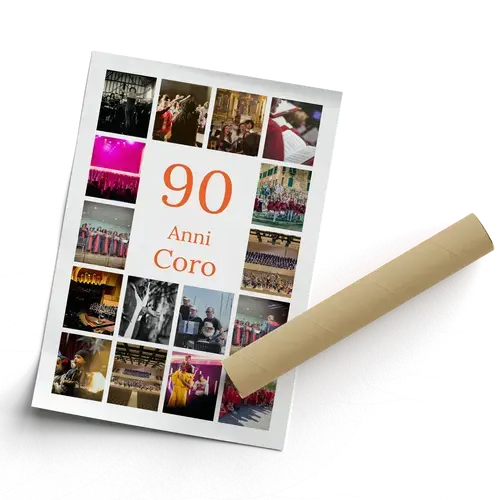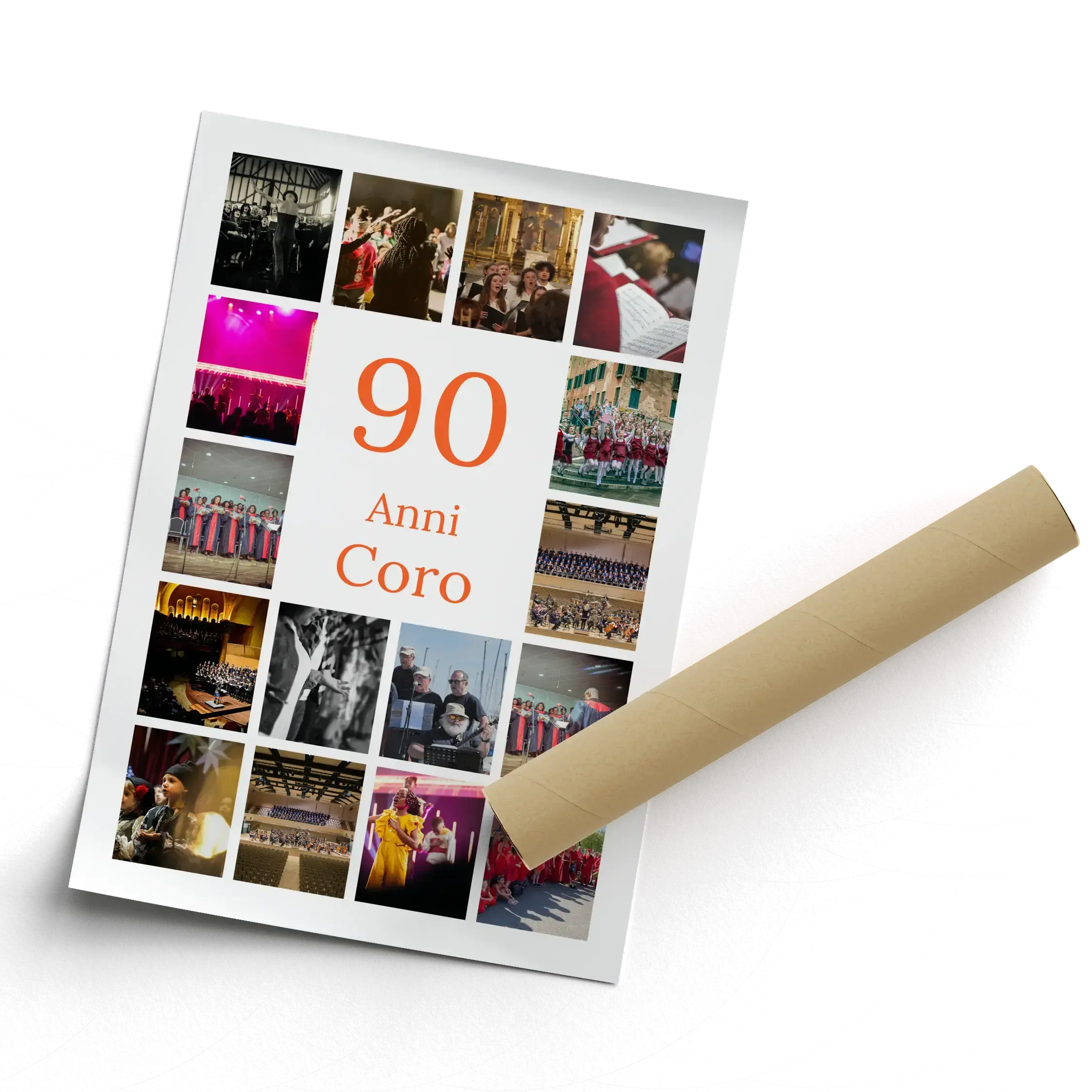 Personalizza e ordina adesso. La Collage Numero 90 mette una grande 90 al centro, con il nome in alto e un saluto sotto, circondata da 20–80 foto in griglia. Puoi cambiare numero, nome, dedica, quantità di immagini, colori, sfondo e orientamento. Perfetta per compleanni, giubilei e celebrazioni dei 90 anni in famiglia.