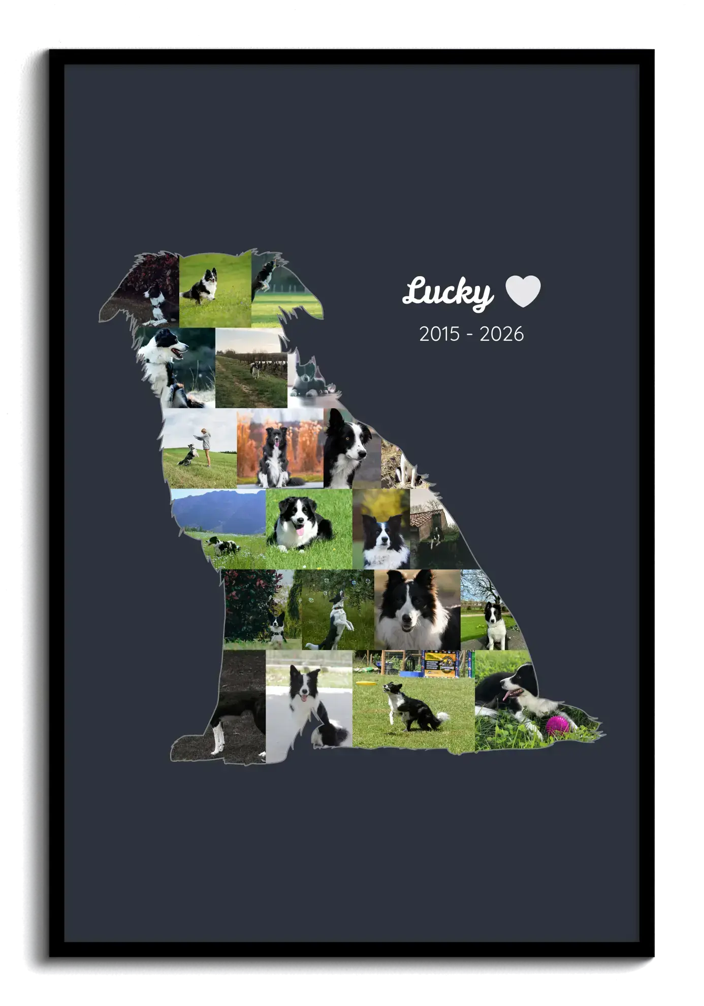 Personalizza e ordina ora. Questa stampa mostra la silhouette di un cane riempita con molte foto, su fondo scuro, con nome e anni di vita accanto. Appartiene alla categoria Animali – Lutto (Silhouette) ed è modificabile con le tue immagini, il nome, gli anni e un testo opzionale; un ricordo sincero o un regalo.