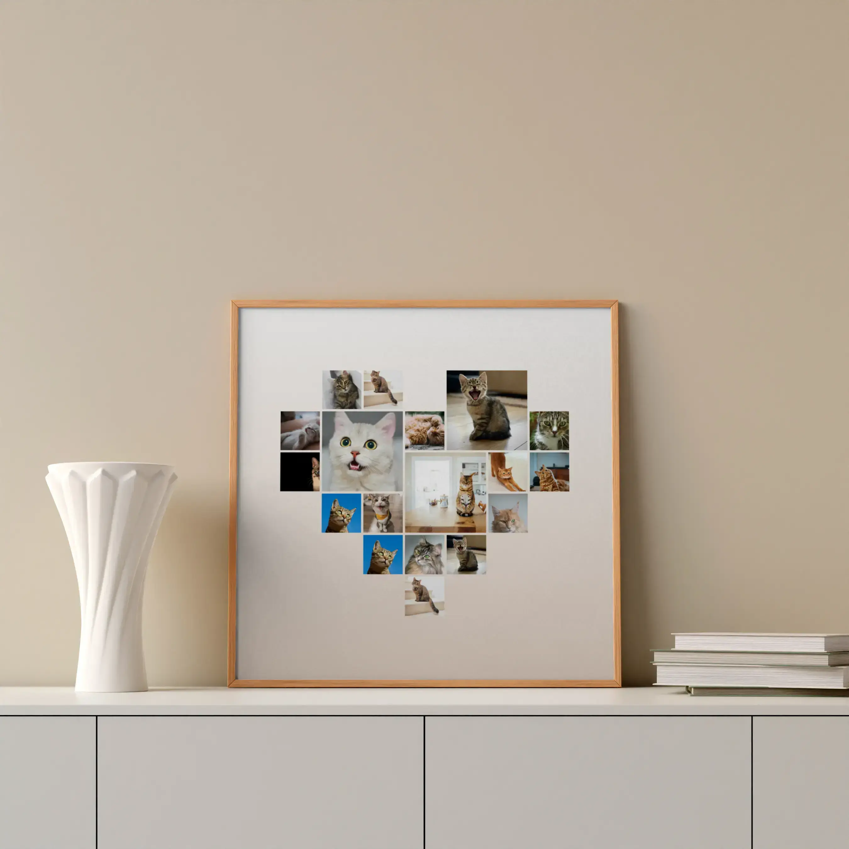 Inizia ora e crea la tua stampa personalizzata! Esempio: raccogli le foto del tuo gatto e disponile in una sagoma a cuore, aggiungendo un testo a tua scelta, per esempio Unser Liebling o il suo nome. Scegli colori e sfondo, rifinisci l’insieme e ottieni un risultato dolce e moderno, perfetto da appendere o regalare.