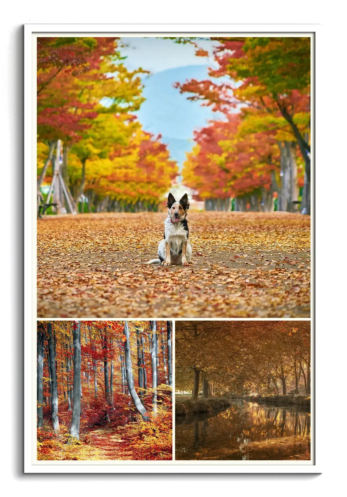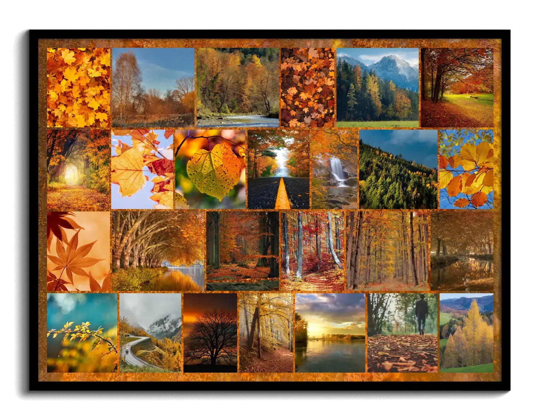 Cattura l'essenza autunnale con collage fotografici di paesaggi e famiglie, testi personalizzati.