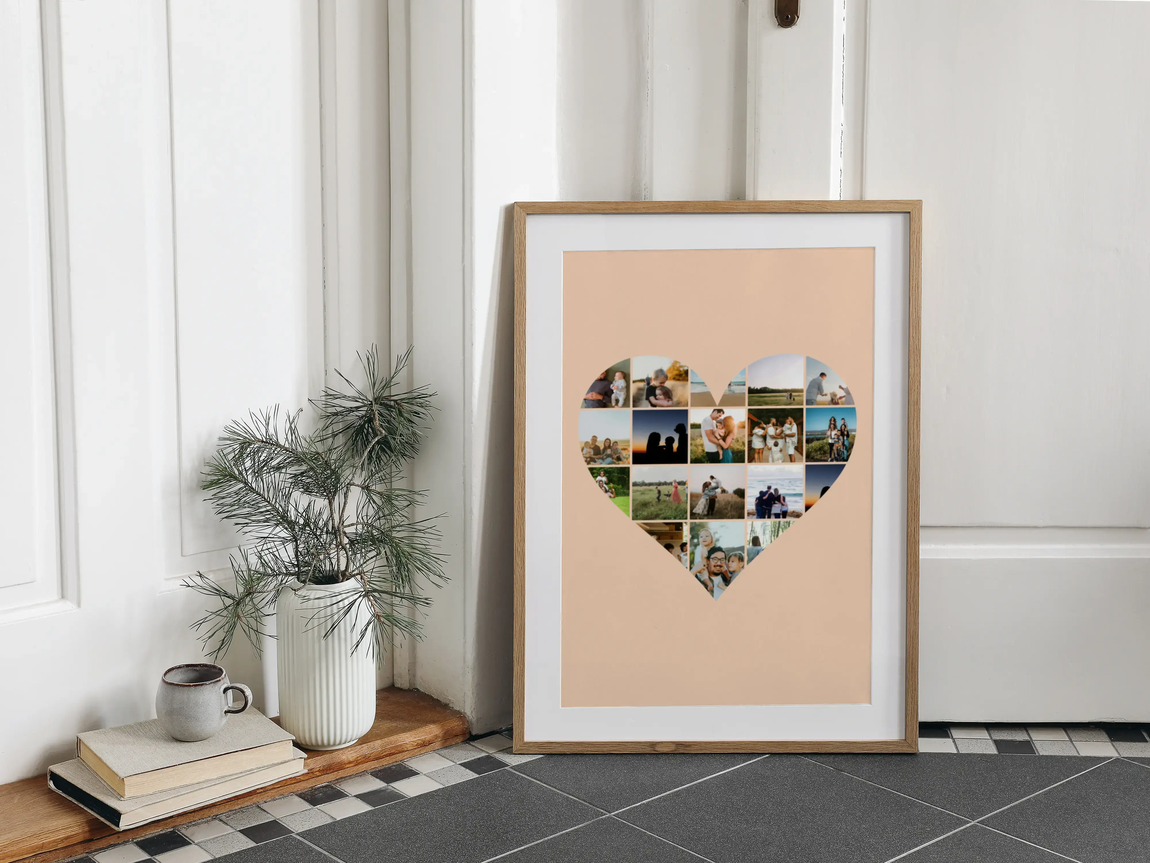 Inizia adesso: crea una stampa personalizzata con le foto della tua famiglia, scegli tra griglia, cuore o testo e racconta la tua storia in modo elegante. Carica gli scatti più belli, aggiungi un titolo come Family Happiness, regola colori e composizione e ottieni un pezzo unico pronto da appendere.