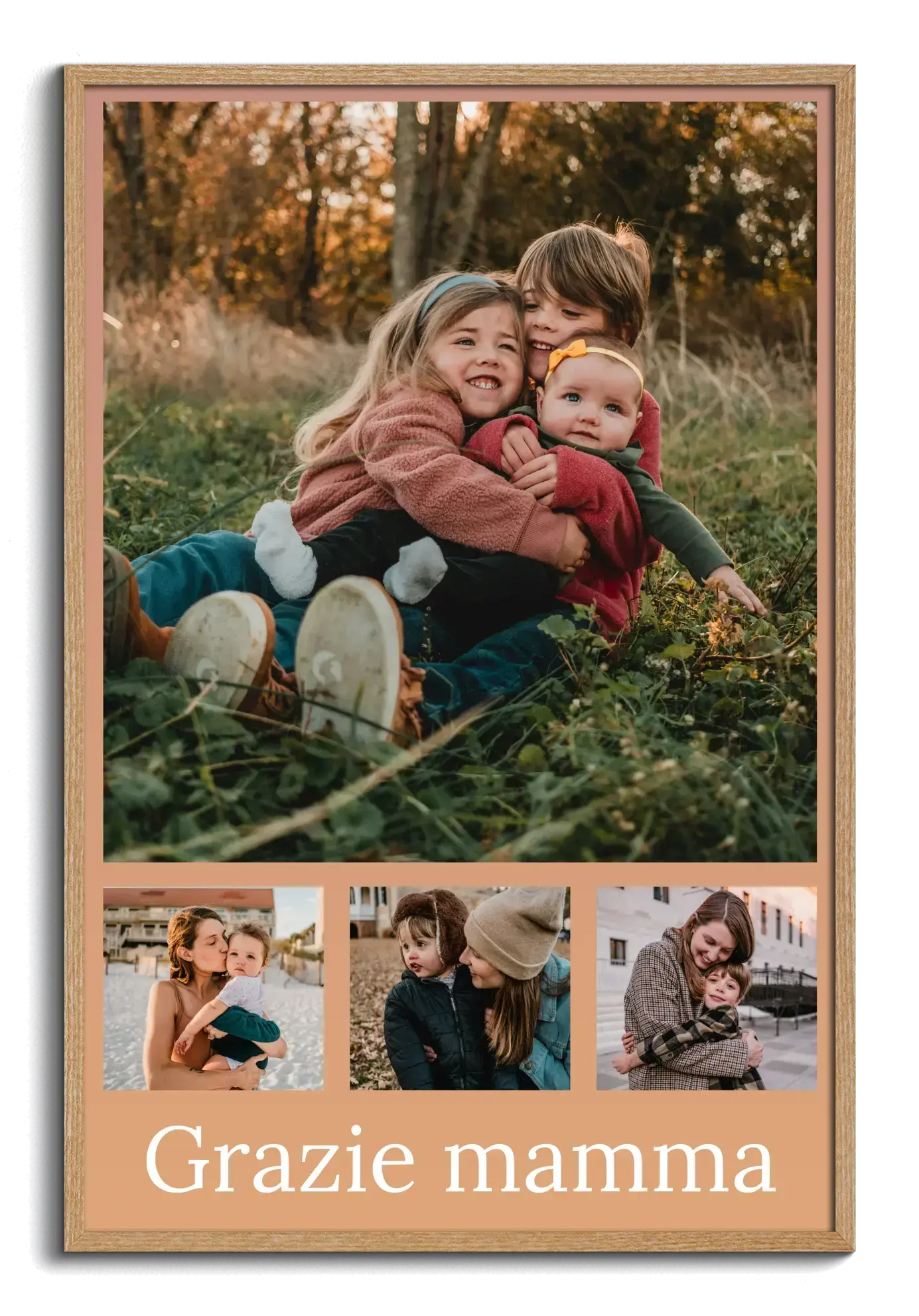 Crealo e ordina subito: un quadro personalizzato perfetto per la Festa della Mamma o del Papà. Scegli un cuore, una griglia o un grande testo, inserisci le foto dei bambini o dei nipoti e aggiungi un messaggio speciale come tanti auguri mamma o grazie papà. Disponibile in molte misure e supporti premium, pronto da regalare.