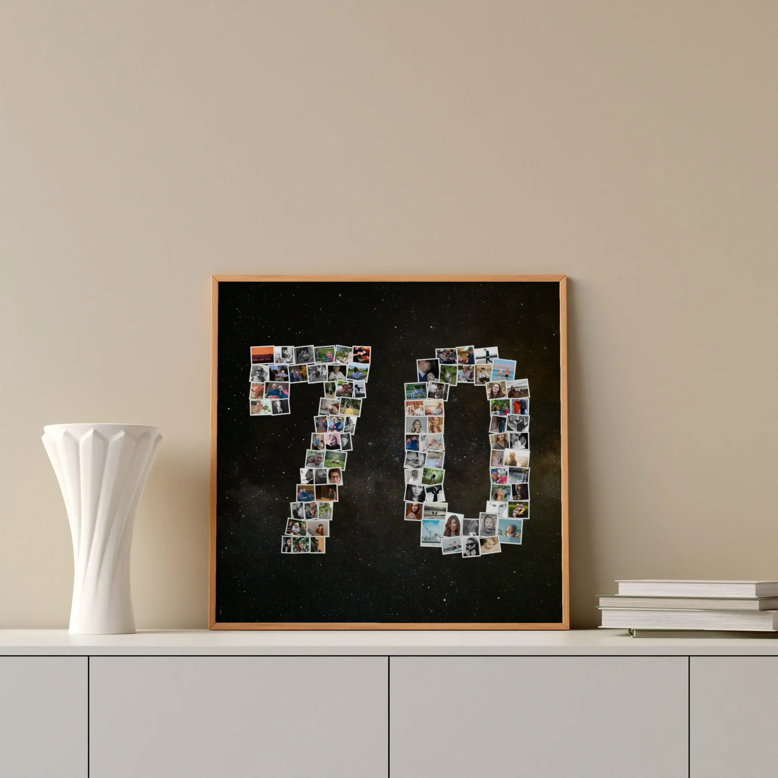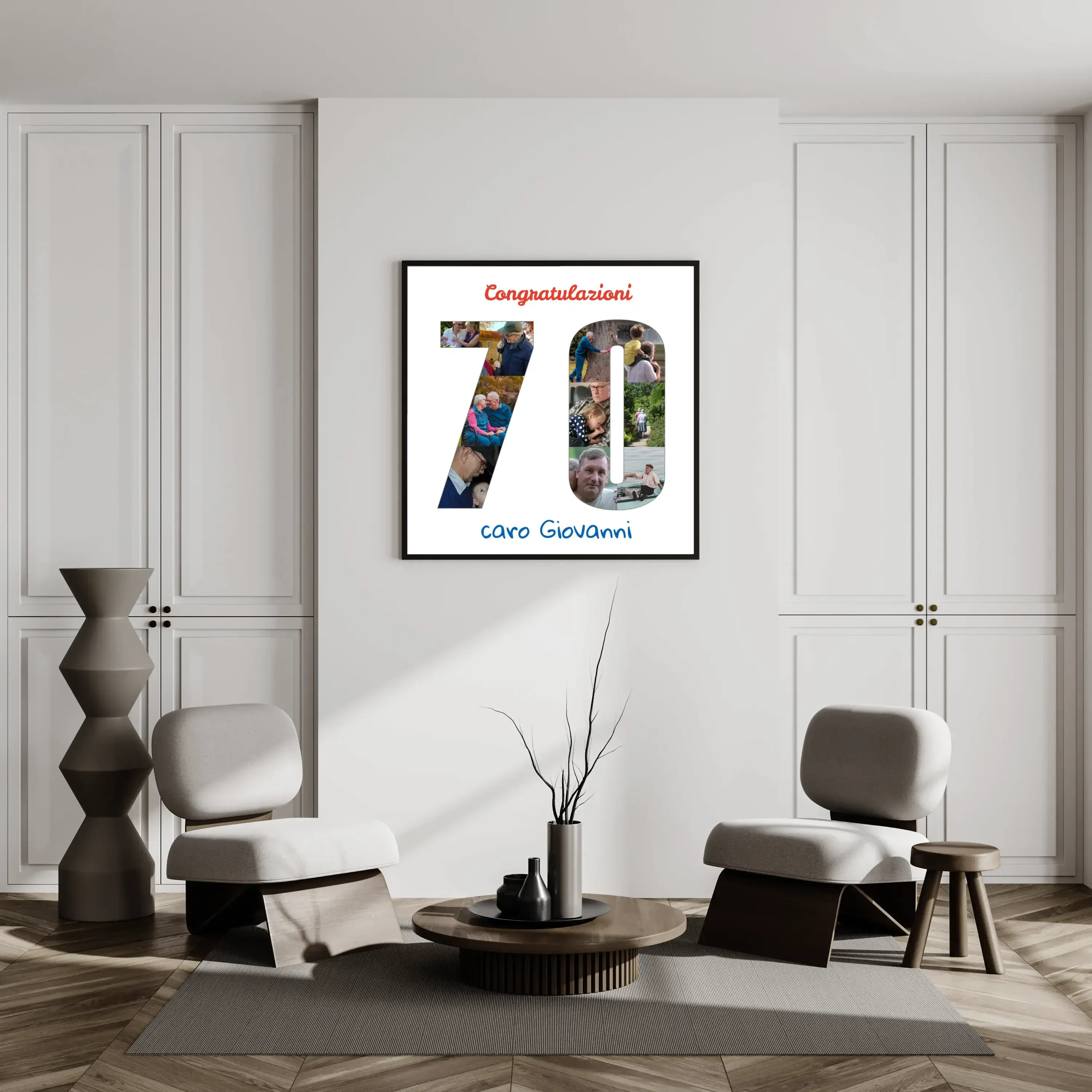 Crea la tua fotocollage personalizzata e sorprendi i tuoi cari con un regalo unico! Immagina la gioia di vedere una speciale composizione con la cifra '70' formata dai momenti più preziosi. Perfetta per celebrare il settantesimo compleanno, la nostra fotocollage può contenere da 1 a 100 foto, a seconda dello stile e del numero scelti.