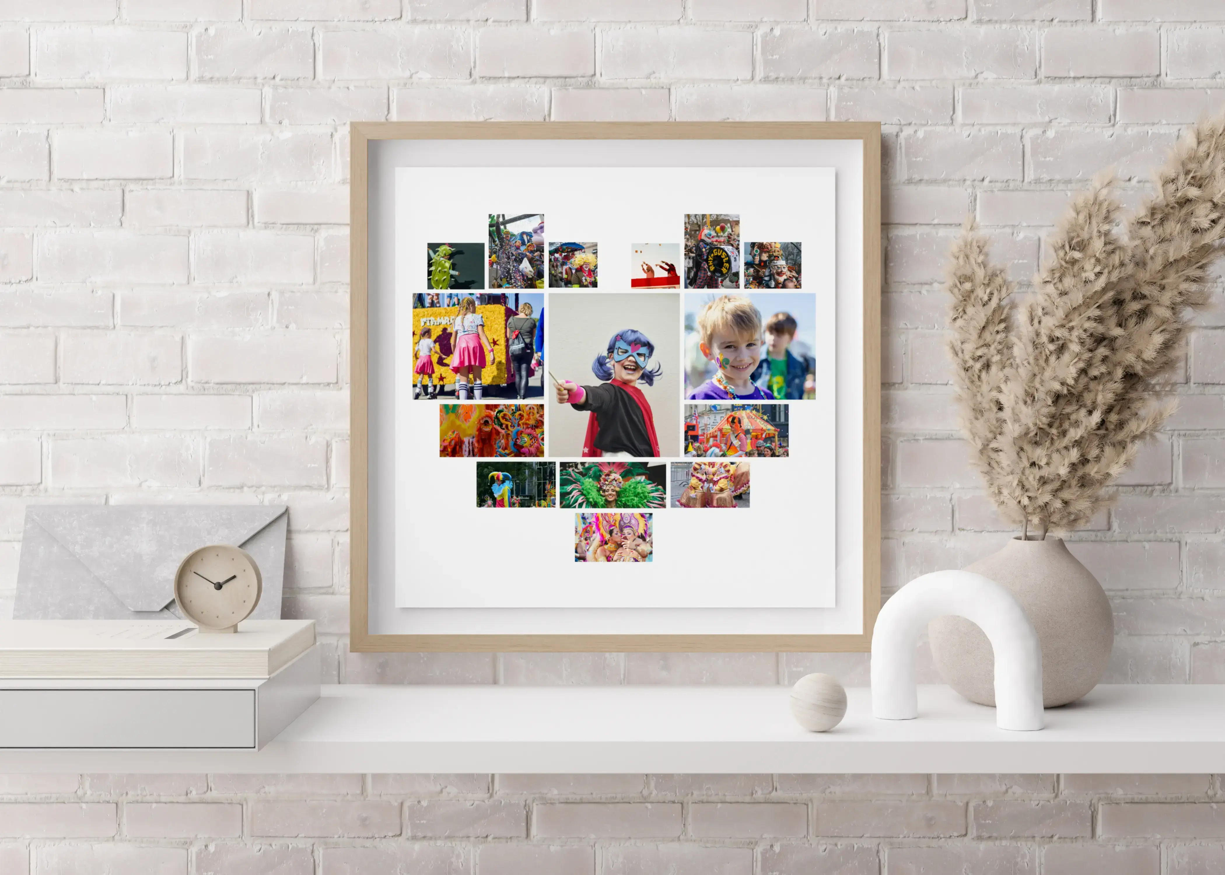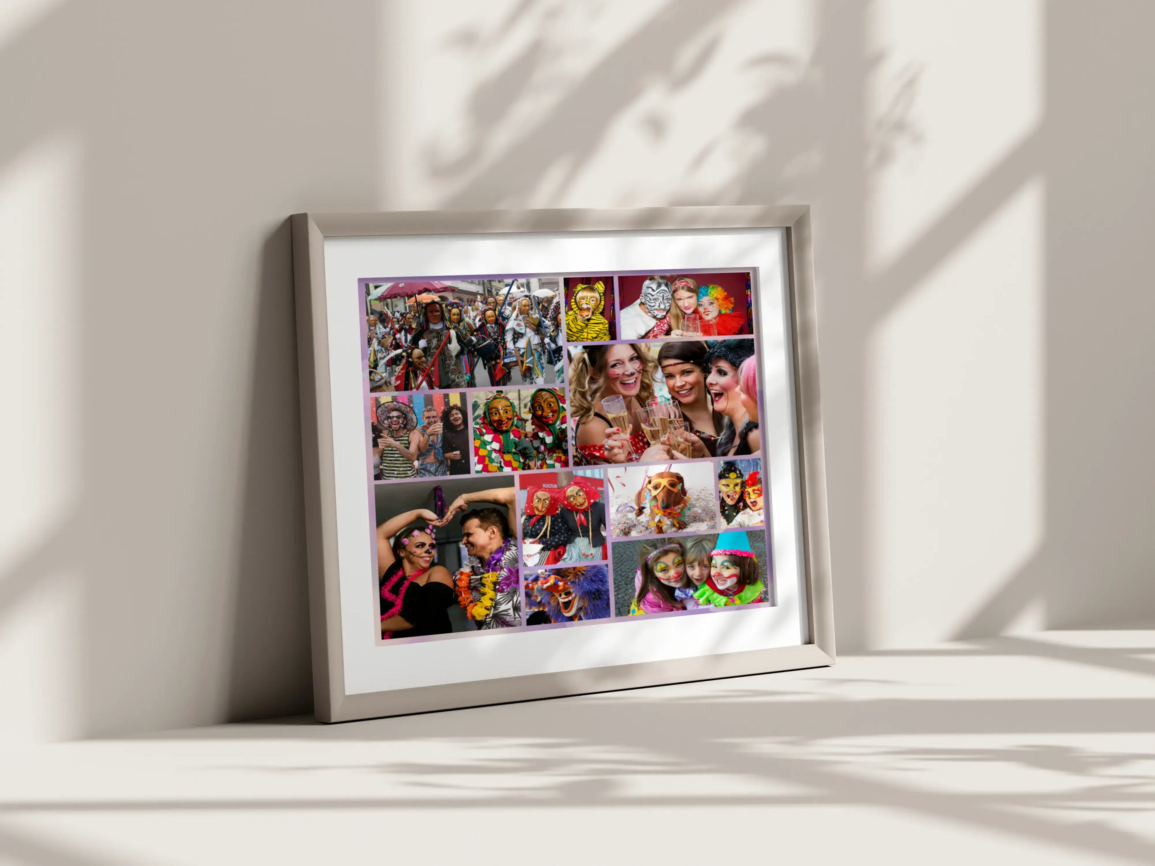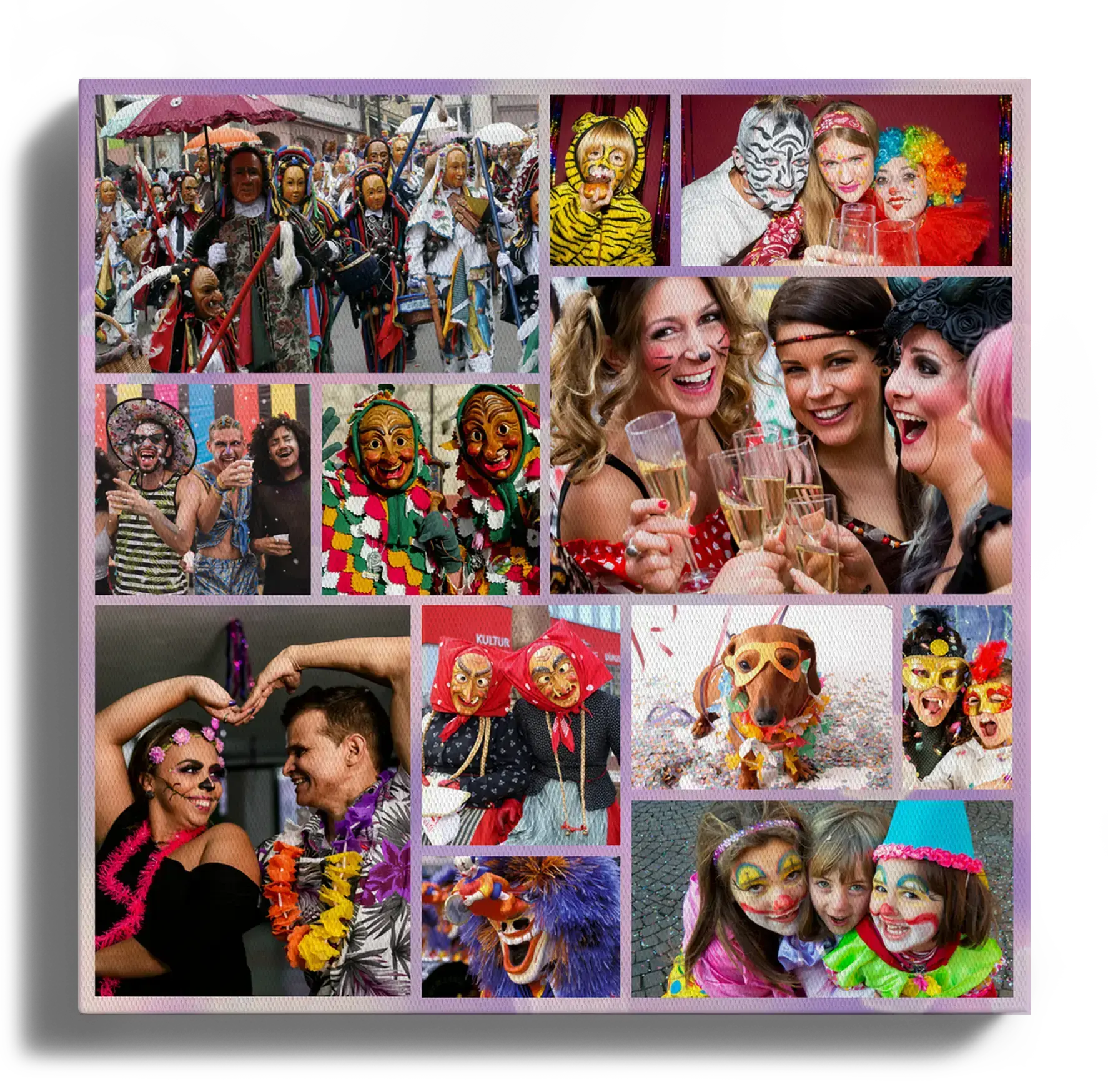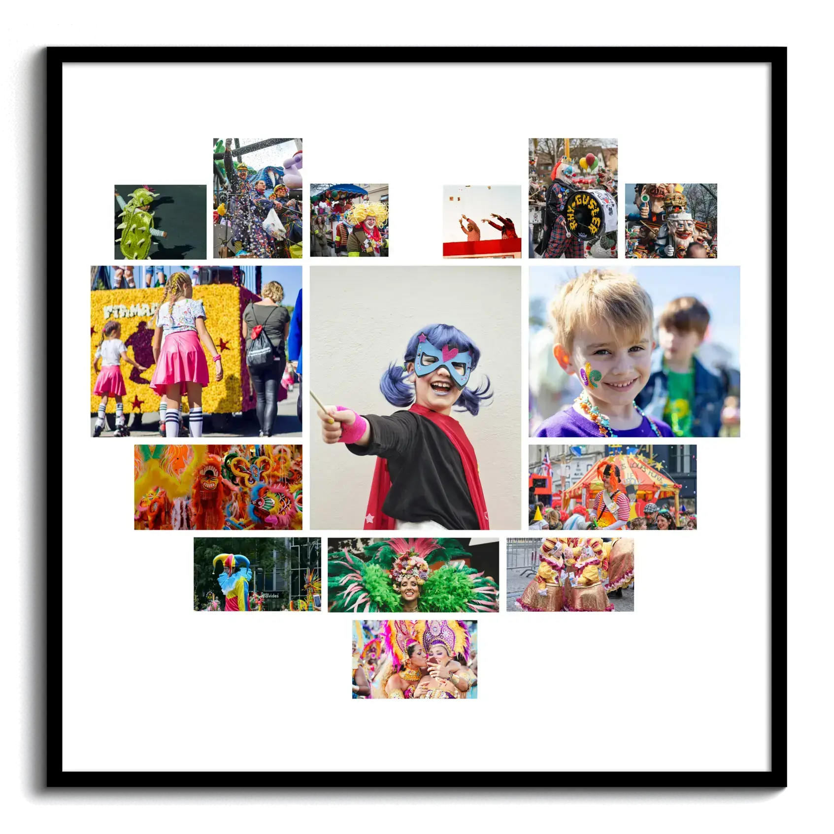 Ordina ora il tuo poster d’arte personalizzato in tema Carnevale. Trasforma foto di famiglia, bambini e amici in maschera, scatti di sfilate e coriandoli in una decorazione stagionale vivace. Scegli modelli come cuore, griglia o numeri e inserisci un testo a piacere, per esempio Bunter Karneval o Carnevale a colori.