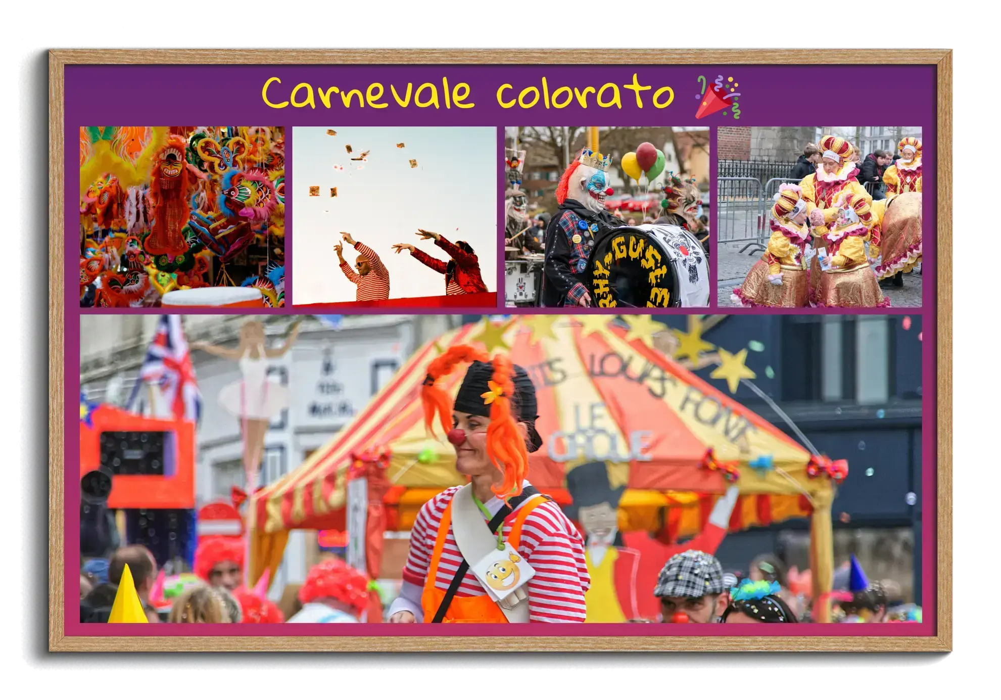 Collage fotografici di Carnevale: famiglie, bambini e costumi, con testi personalizzati.