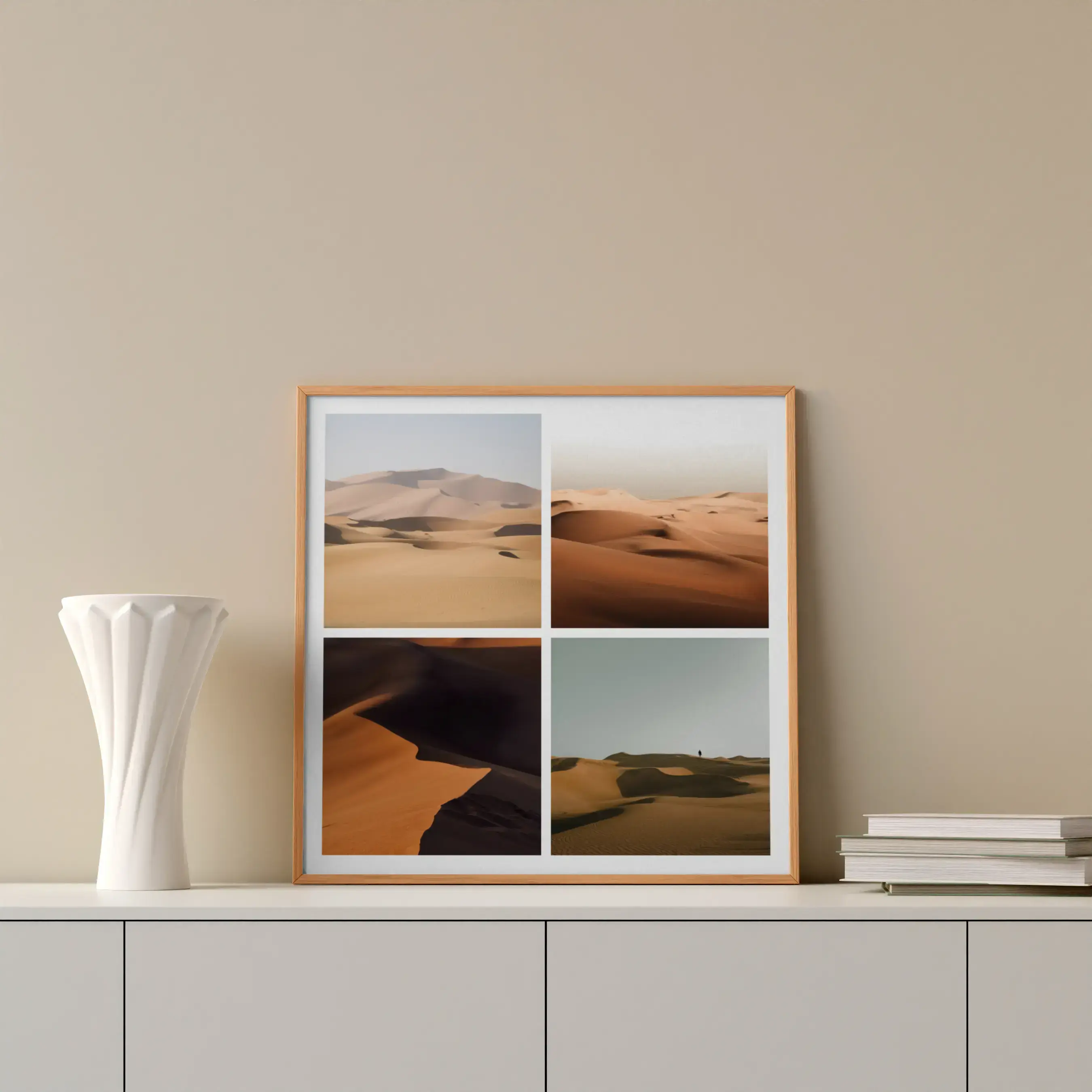 Inizia ora: crea la tua stampa personalizzata. In questo esempio valorizzi scatti di fenomeni naturali unici con layout studiati per la natura: dune sinuose nel deserto, ghiacciai maestosi e grotte di ghiaccio dai riflessi blu. Seleziona modelli di collage premium e metti in evidenza texture, linee e luci con una resa di stampa brillante.