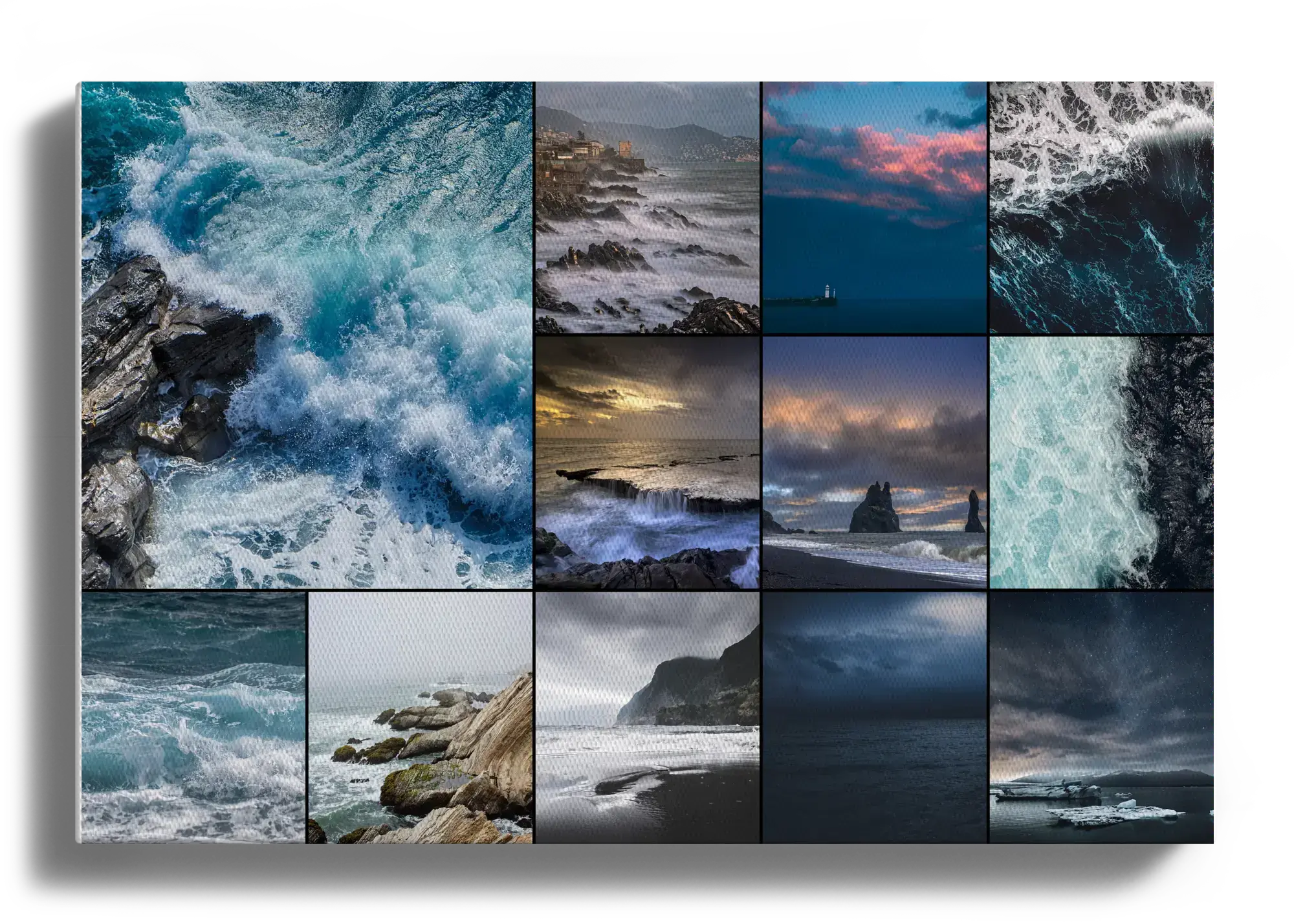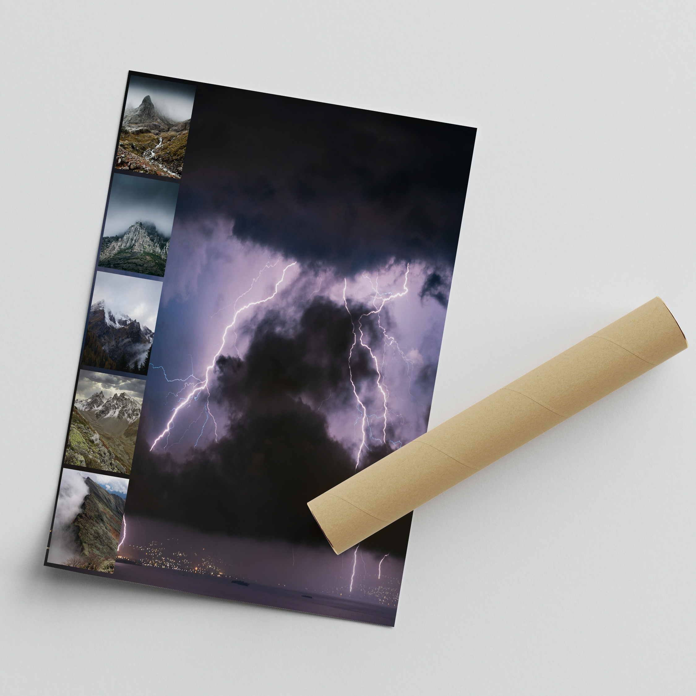Inizia ora: crea una stampa personalizzata dedicata alla fotografia di natura, paesaggi e animali. Questo esempio mette al centro i fenomeni meteo: nebbie che scorrono su campi, coste, boschi e montagne, e cieli di temporale dal taglio drammatico, organizzati in modelli eleganti e stampati con qualità premium.