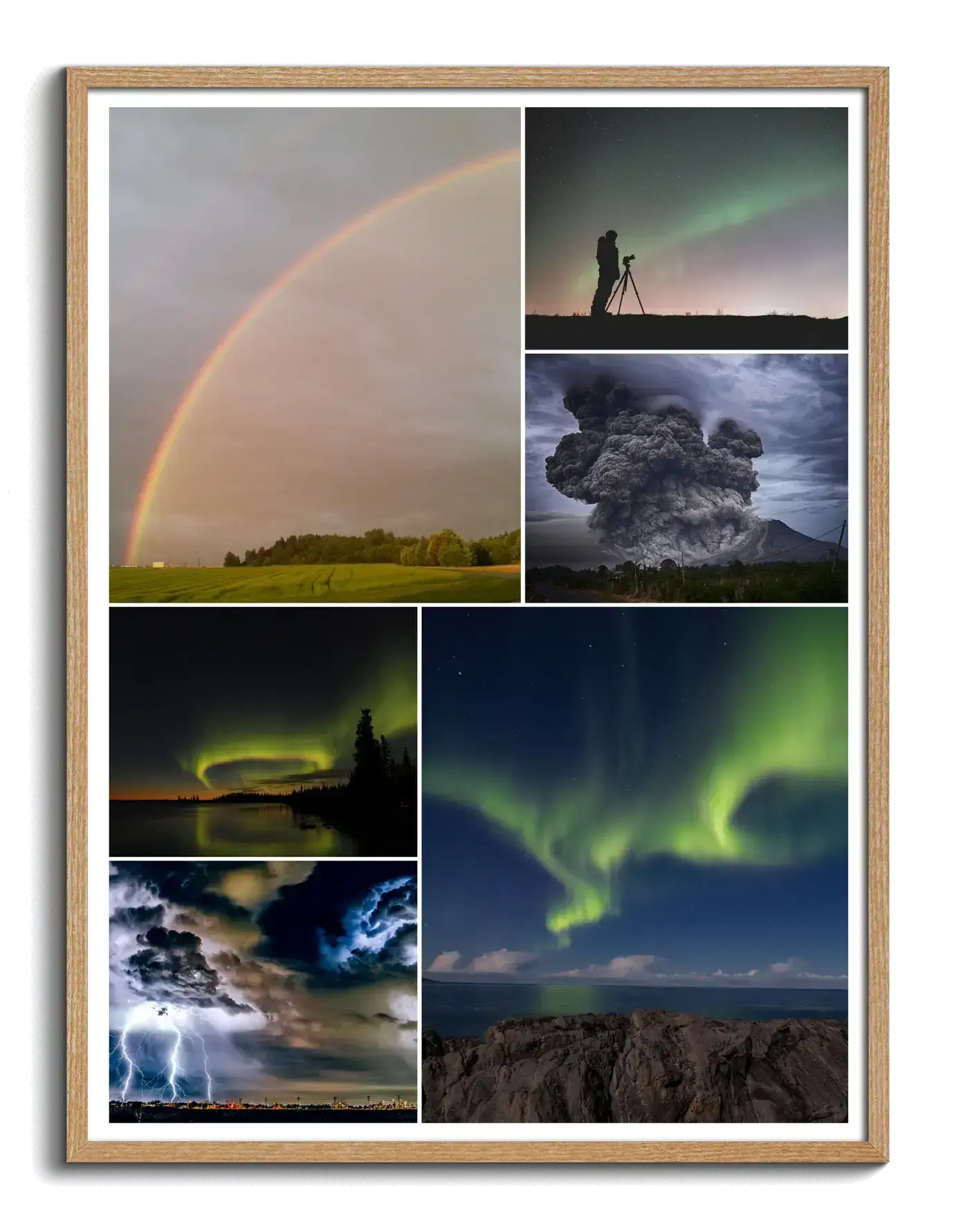 Fenomeni naturali in collage: aurore, cascate, arcobaleni e temporali in stampa premium.