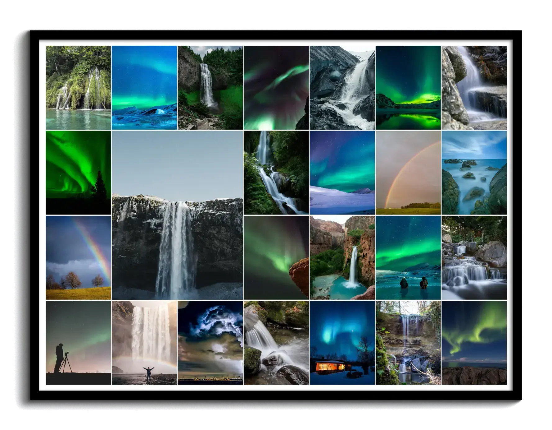 Comincia ora: crea il tuo collage fotografico personalizzato. In questo esempio celebri fenomeni naturali come aurore boreali, cascate e fiumi, arcobaleni e temporali. Metti in scena paesaggi, animali e dettagli della natura con layout studiati per esaltare luci e colori, trasformandoli in una stampa premium nel formato e supporto che preferisci.