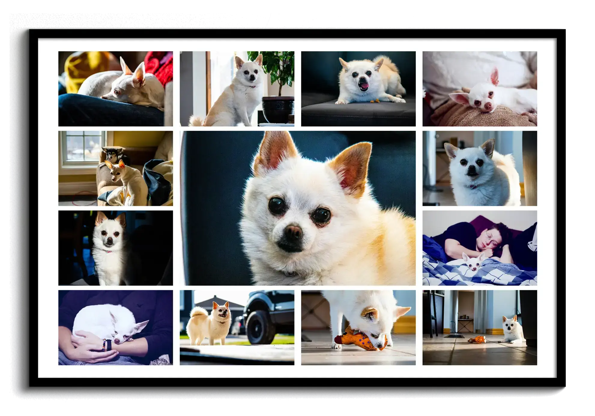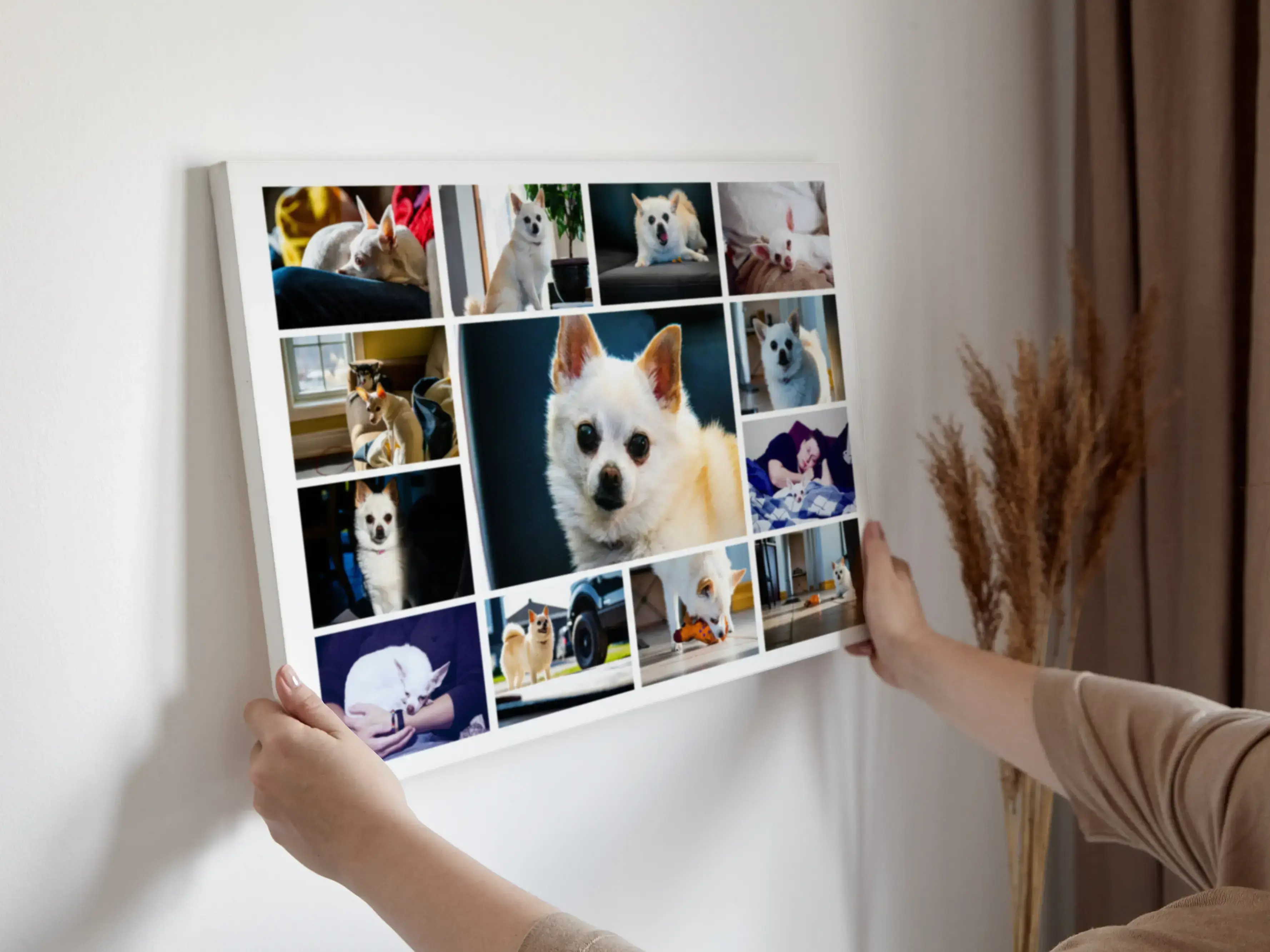 Esplora la magia del design personalizzato e crea la tua esclusiva fotocollage per cani. Con un'immagine prominente del tuo amato amico a quattro zampe nel cuore della composizione e una serie di scatti speciali intorno, darai vita ai tuoi ricordi più preziosi. Scopri la gioia di un'opera d'arte personalizzata che racconta la storia unica del tuo fedele compagno.