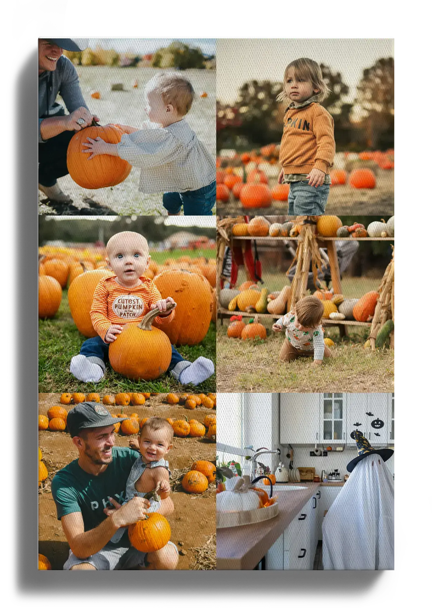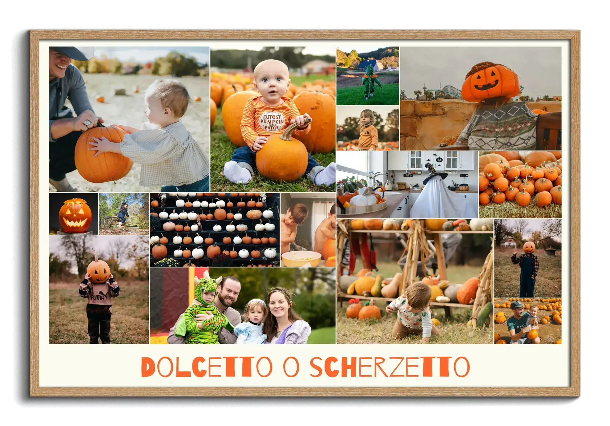 Crea la tua fotocollage personalizzata con le nostre opzioni creative e trasforma i memorabili momenti di Halloween in un'opera d'arte unica. Immagina di combinare le foto dei tuoi cari travestiti con decorazioni come zucche e aggiungi testi come "Süßes oder Saures". La tua immaginazione è il limite!