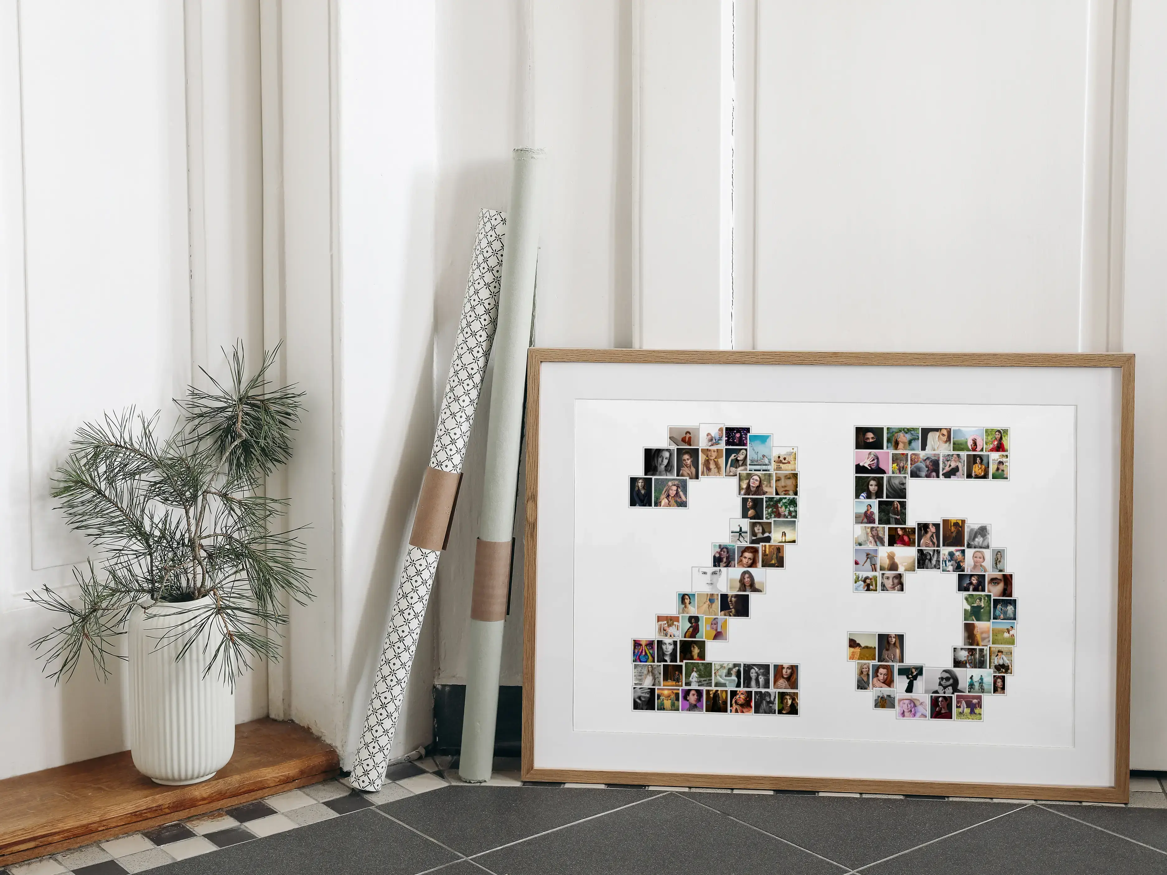 Crea la tua Collage Fotografica personalizzata per celebrare un'occasione speciale con il nostro design a numero '25'. Componi la tua storia con le tue foto preferite: da 1 a 100 immagini si uniscono per formare il numero perfetto per un'anniversario d'argento o un giubileo aziendale. Immergiti ora nella creazione di un regalo unico!