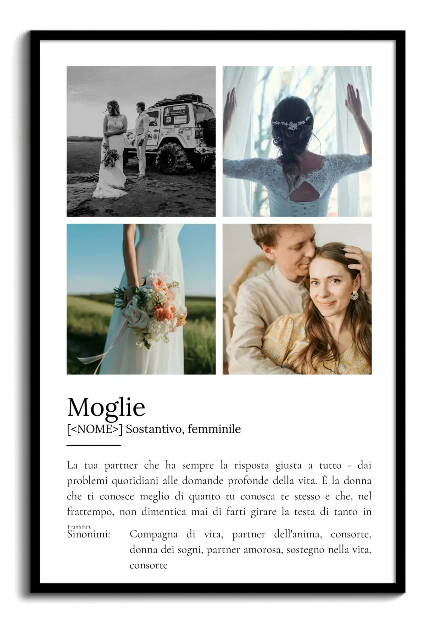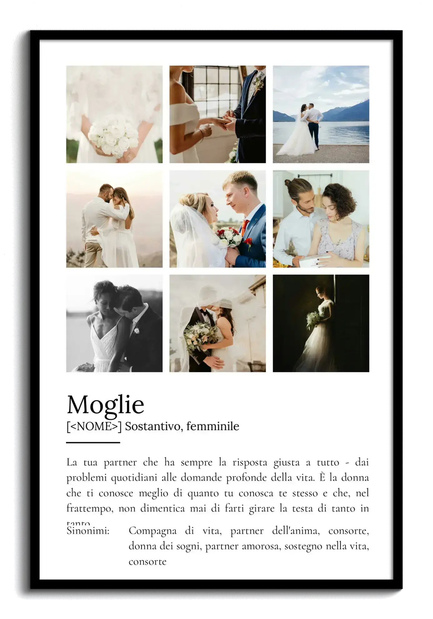 Scopri la magia di trasformare i tuoi ricordi in una straordinaria fotocollage personalizzata. Con il nostro prodotto unico, puoi creare un Definitions-Poster dedicato alla tua "Ehefrau", un regalo speciale che celebra la persona amata. Questo poster in stile Duden offre spazio per uno o più delle tue foto preferite, arricchito da un testo di definizione che recita "Deine Partnerin, die immer die richtige Antwort auf alles hat – von Alltagsproblemen bis hin zu tiefen Lebensfragen. Sie ist die Frau, die dich besser kennt als du selbst und dabei nie vergisst, dir hin und wieder den Kopf zu verdrehen." Personlizza testo, colore, foto e layout a tuo piacimento.