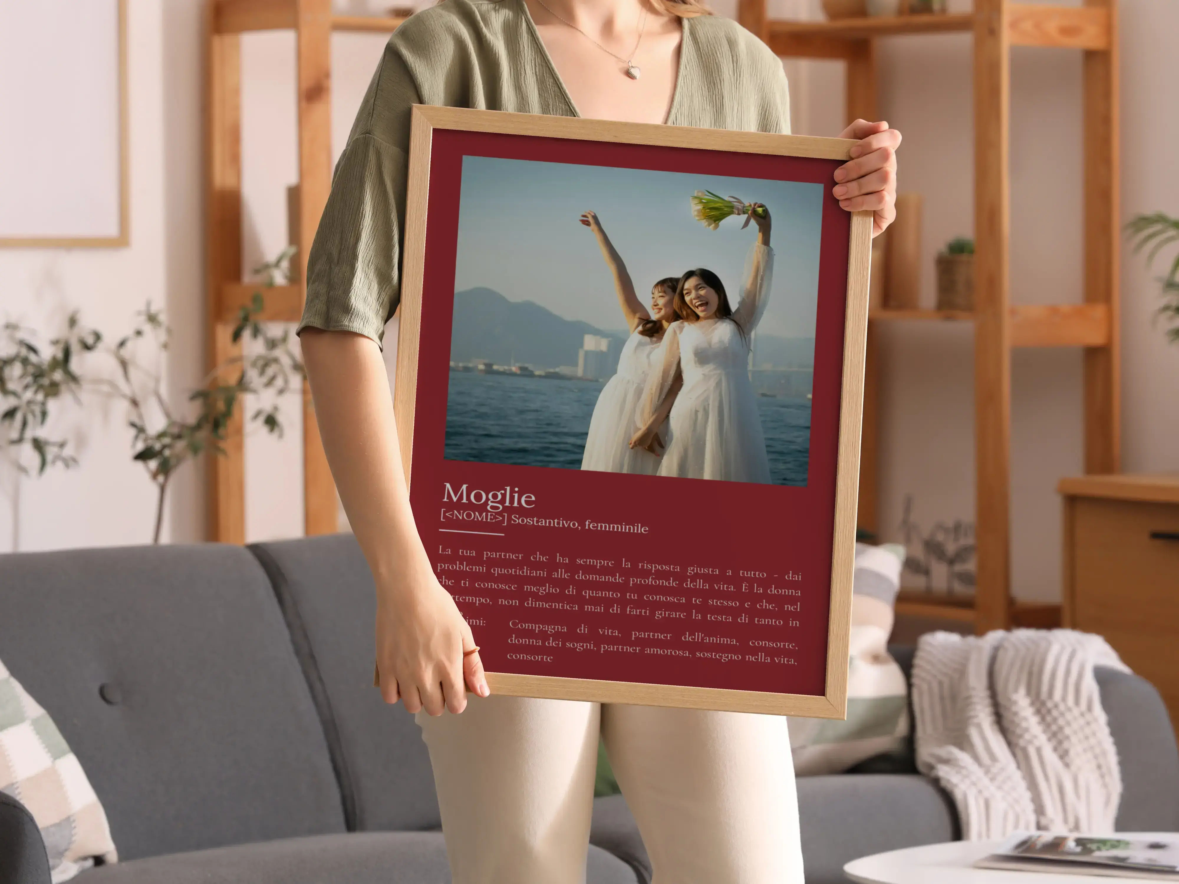 Scopri la magia di trasformare i tuoi ricordi in una straordinaria fotocollage personalizzata. Con il nostro prodotto unico, puoi creare un Definitions-Poster dedicato alla tua "Ehefrau", un regalo speciale che celebra la persona amata. Questo poster in stile Duden offre spazio per uno o più delle tue foto preferite, arricchito da un testo di definizione che recita "Deine Partnerin, die immer die richtige Antwort auf alles hat – von Alltagsproblemen bis hin zu tiefen Lebensfragen. Sie ist die Frau, die dich besser kennt als du selbst und dabei nie vergisst, dir hin und wieder den Kopf zu verdrehen." Personlizza testo, colore, foto e layout a tuo piacimento.