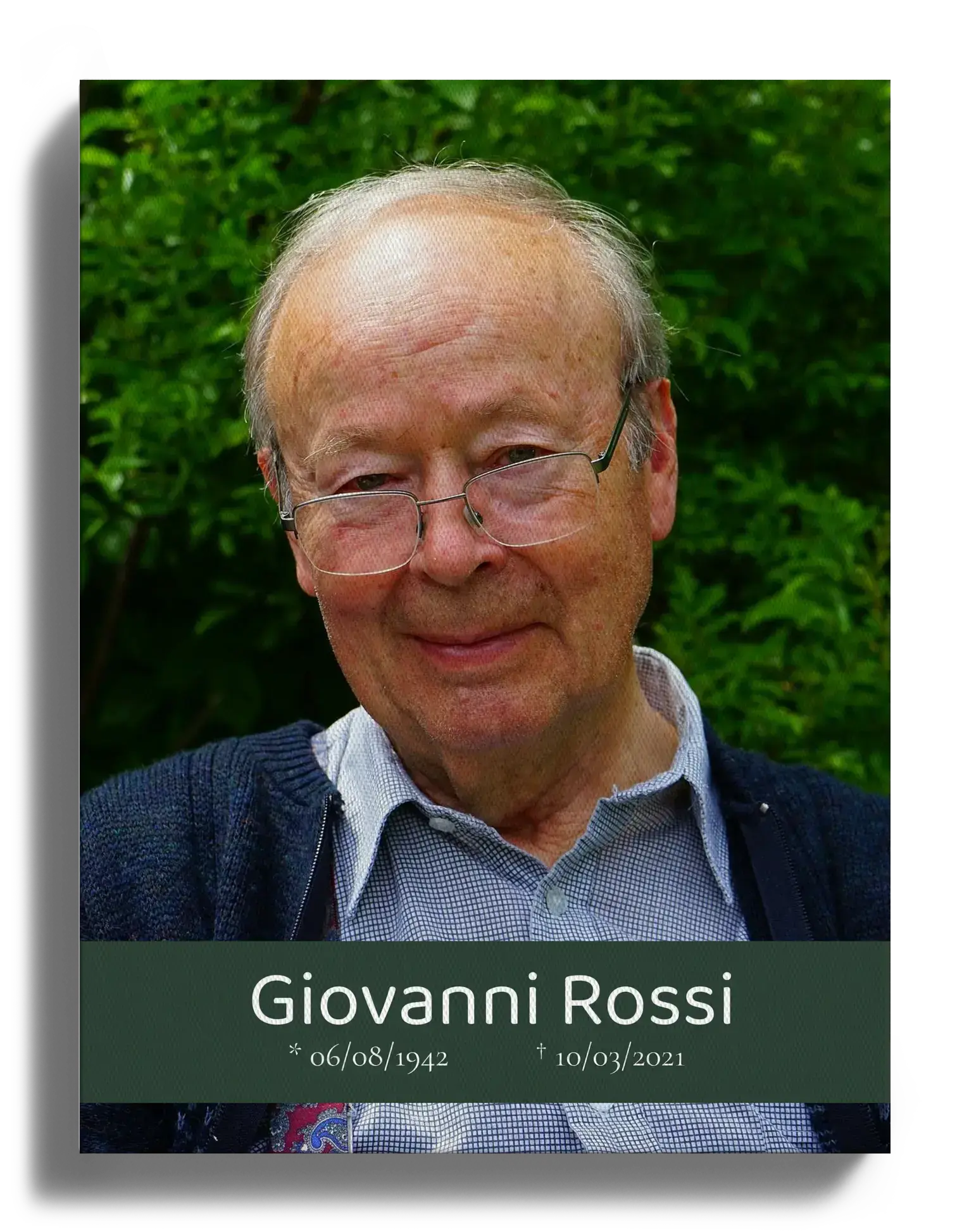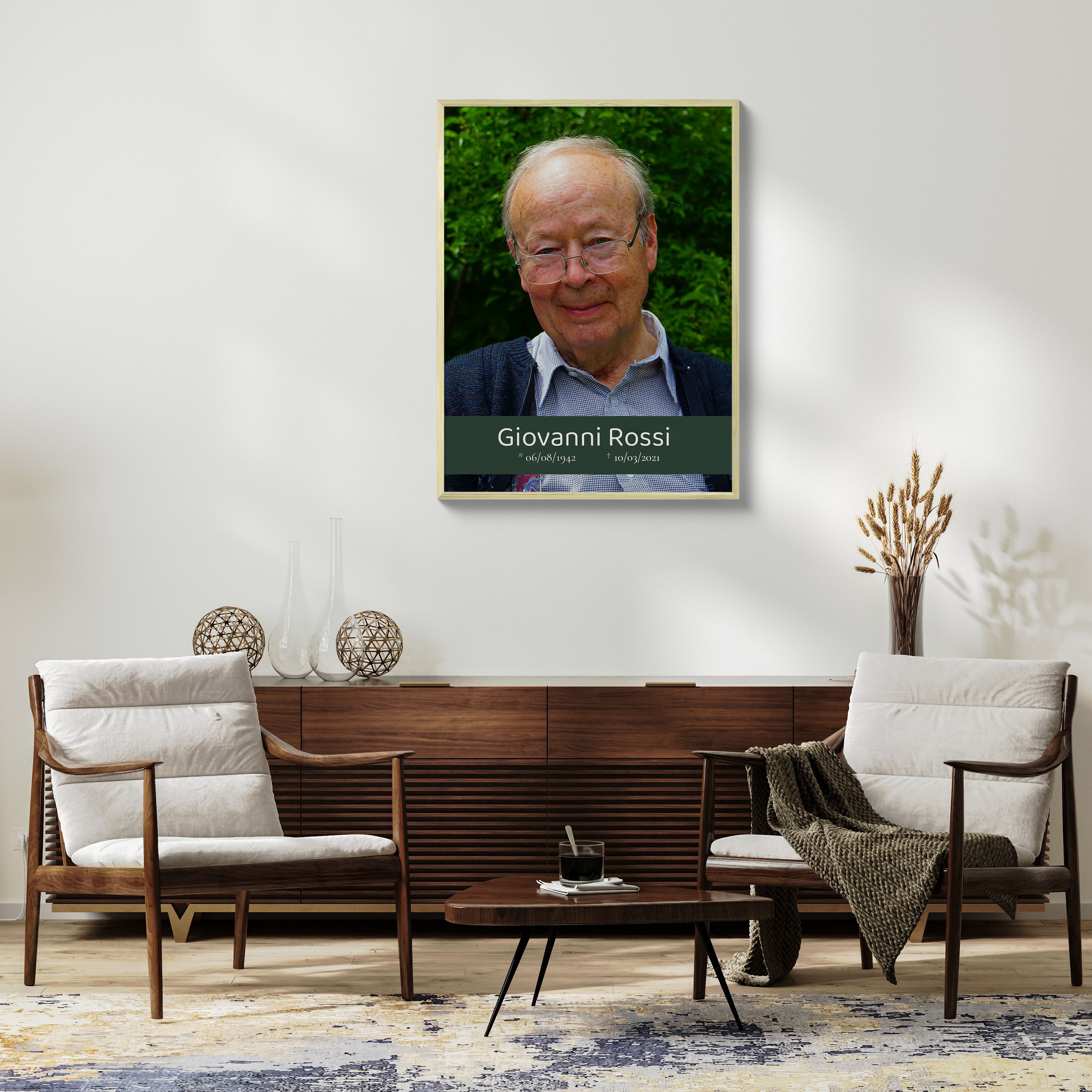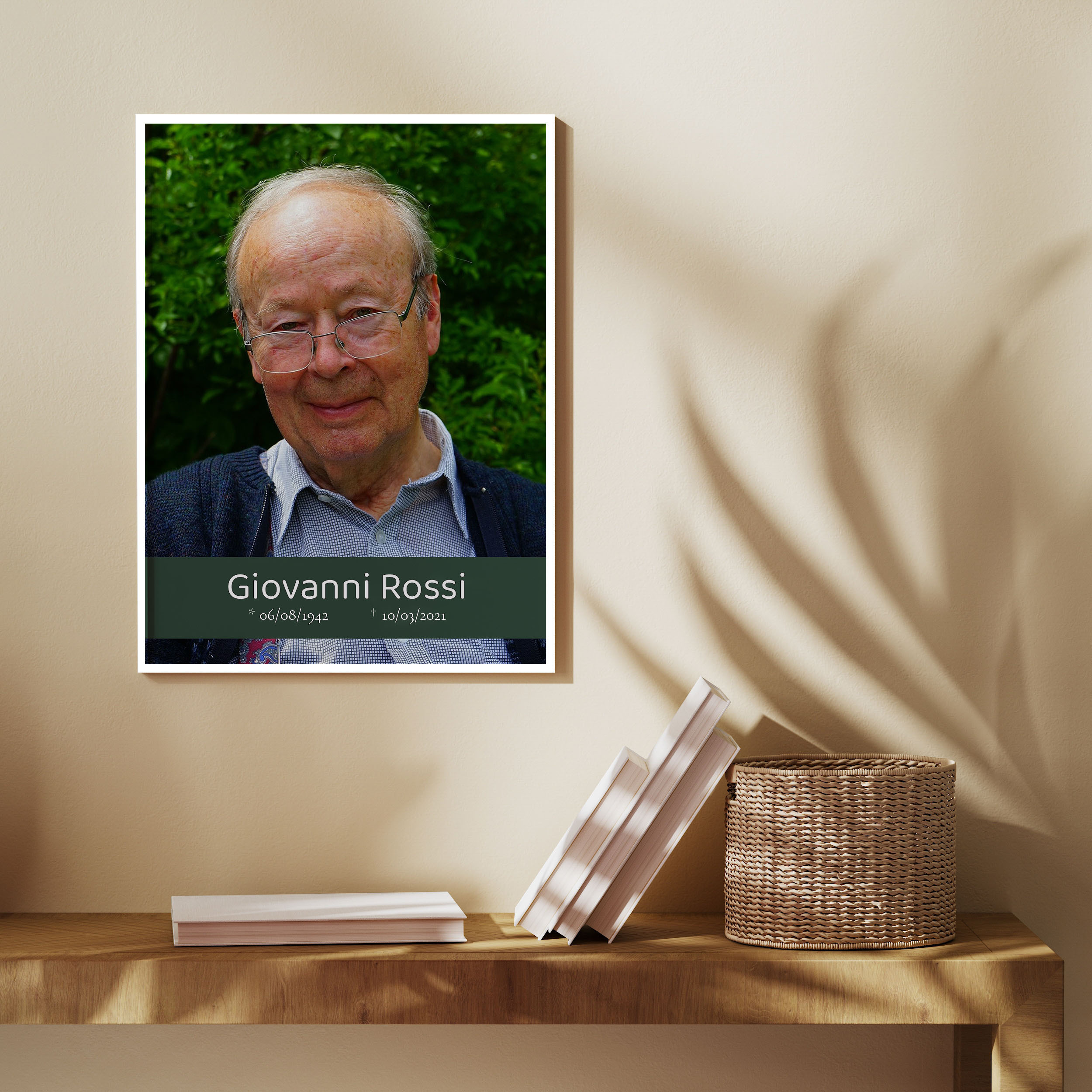Crea un ricordo eterno con il nostro prodotto personalizzato. Questa fotocollage commemorativa ti permette di onorare un amato scomparso in maniera elegante. Con un'immagine centrale che occupa l'intera tela e un banner testuale scuro per nome, data di nascita e di scomparsa, è l'ideale per eventi commemorativi o come toccante ricordo a casa. Ogni elemento, dal ritratto al testo, è completamente personalizzabile.