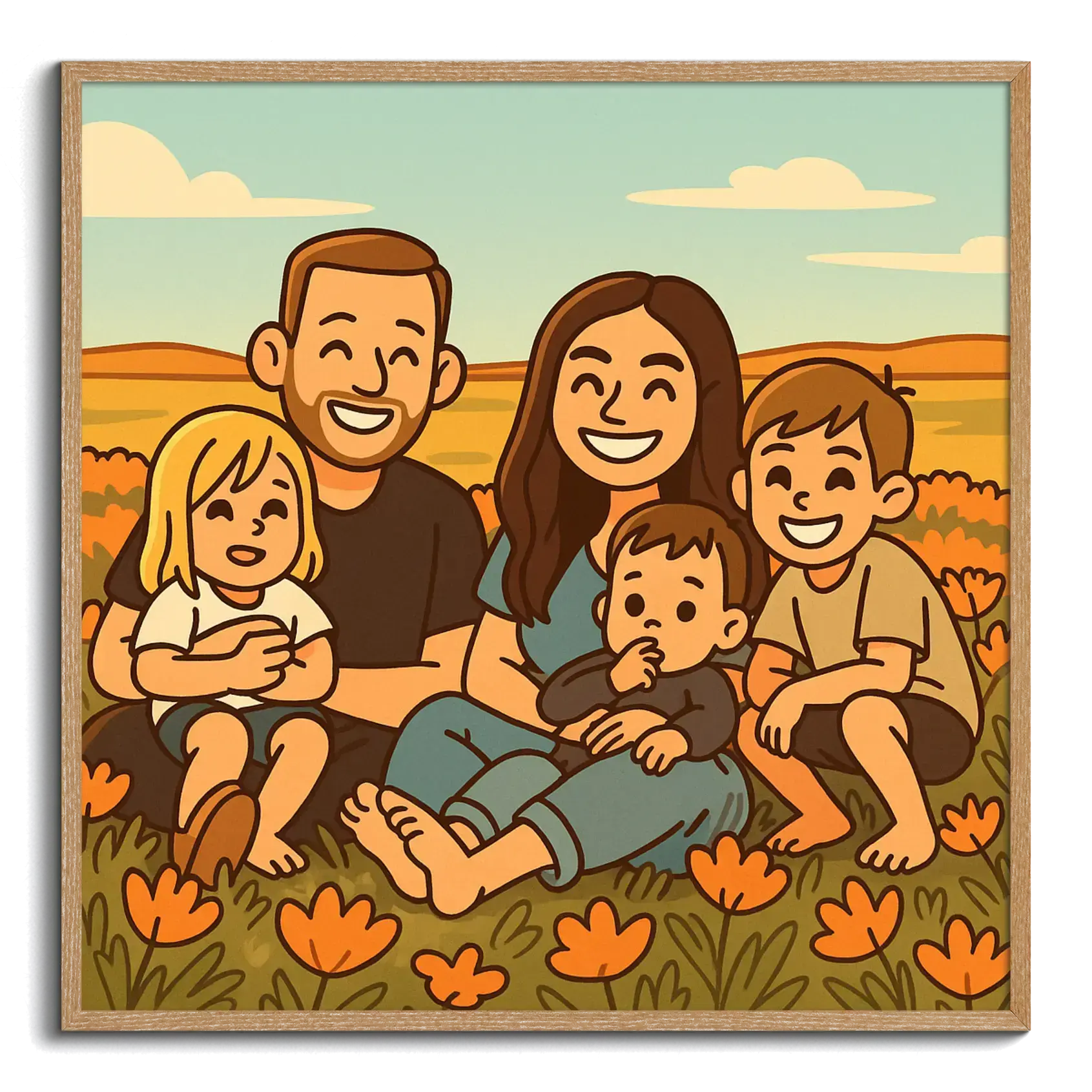 Stile cartoon semplice con contorni spessi, colori caldi e tratti del viso semplificati e adorabili – senza bordo bianco.